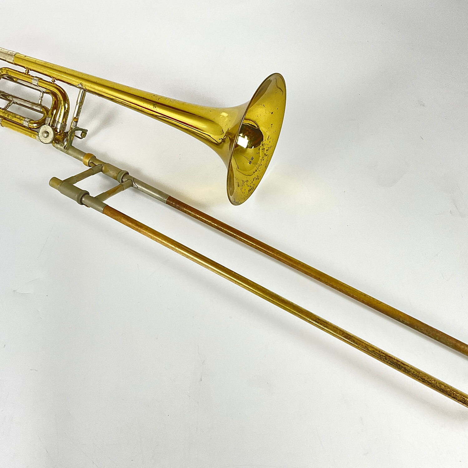 Used Bach 42B Professional Bb/F Tenor Trombone in lacquer finish. Features include a .547" bore handslide, closed wrap rotor valve section, and 8.5" yellow brass bell flare. Instrument is in good condition apart from surface scratching, dings/dents, and heavy lacquer wear throughout. Most of the outer handslide is unlacquered. Includes original case.