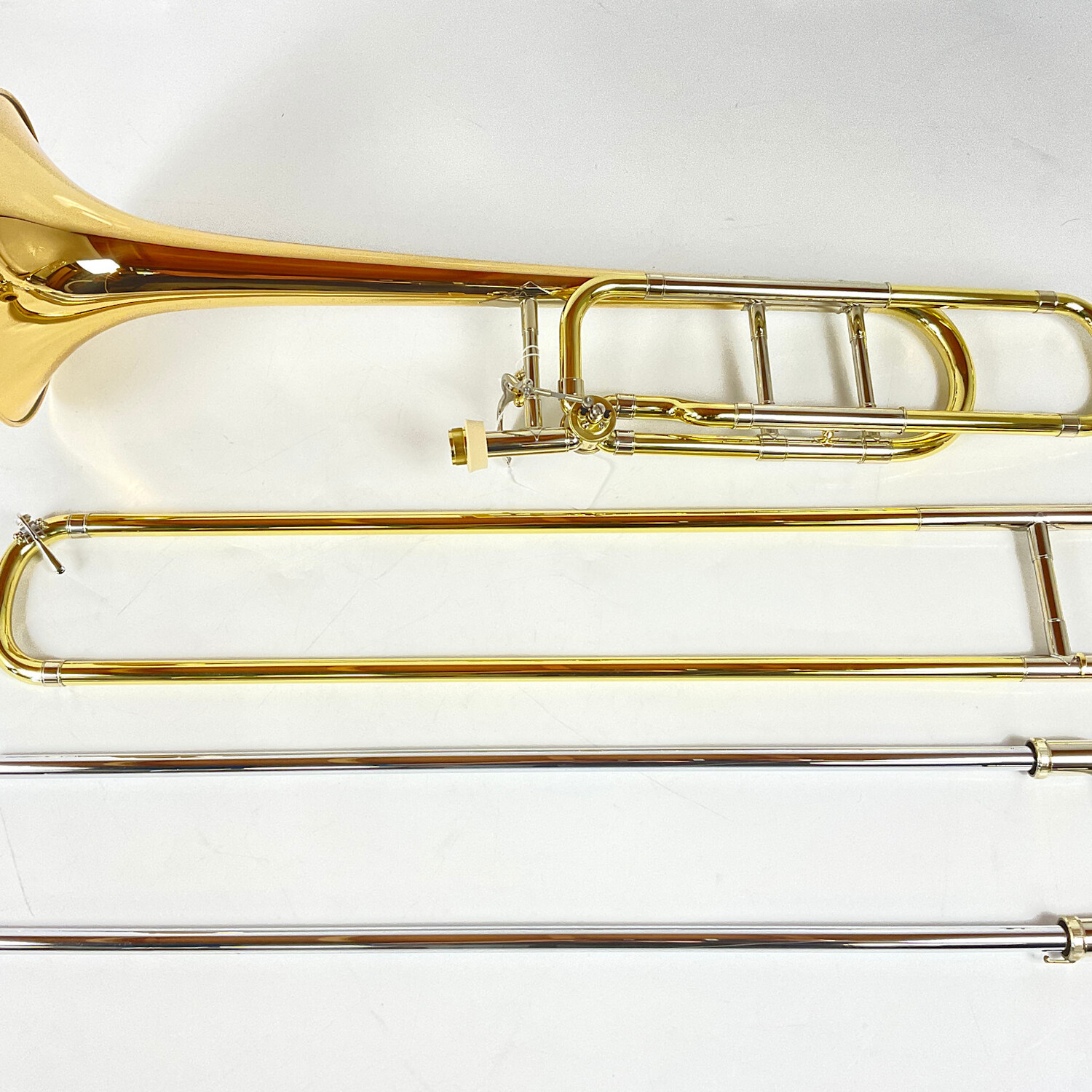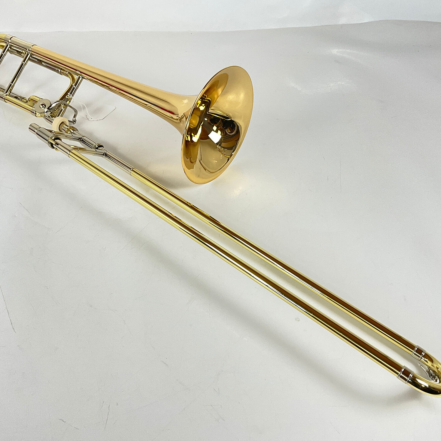 Demo Bach 42BOG Bb/F tenor trombone in lacquer finish. Features include a .547" bore yellow brass handslide, 8.5" hand-hammered gold brass bell, and an open wrap rotor valve section. Instrument is in very good condition apart from minor surface imperfections. Includes Protec case.