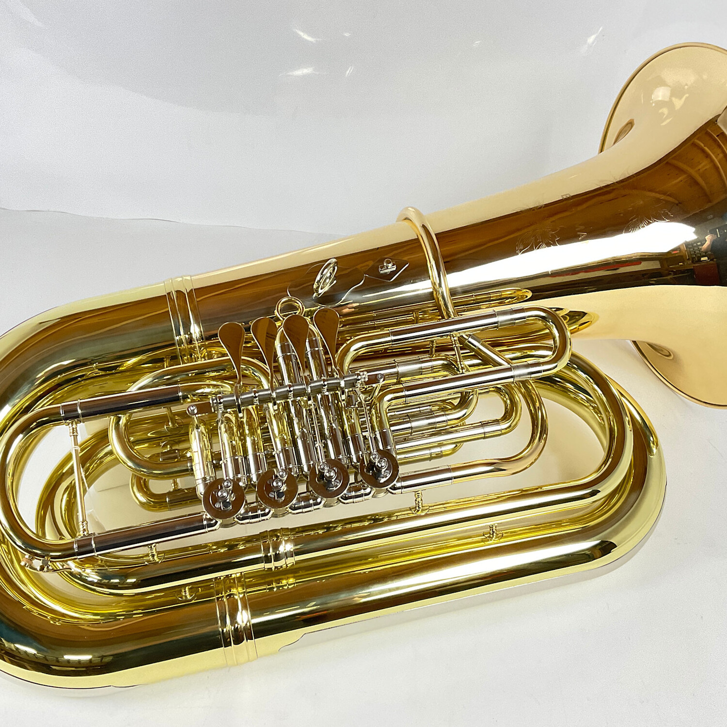 Demo Eastman EBB825G BBb tuba (SN: Y2400867) in lacquer with factory hard-shell case. 19" upright bell and 4 rotor valves of .748/.787" bore. Takes American shank tuba mouthpiece. This tuba is in neary new condition.