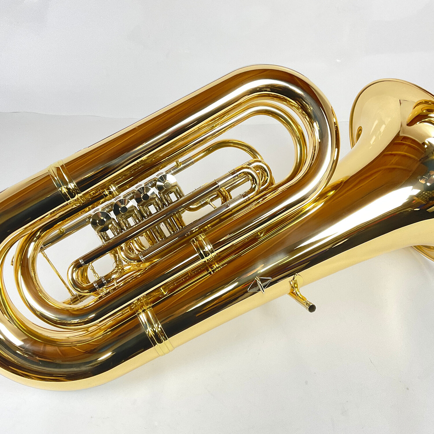 Demo Eastman EBB825G BBb tuba (SN: Y2501494) in lacquer with factory hard-shell case. Gold brass tuba has 19" upright bell and 4 rotor valves of .748/.787" bore. Takes American shank tuba mouthpiece. Tuba is in nearly new condition.