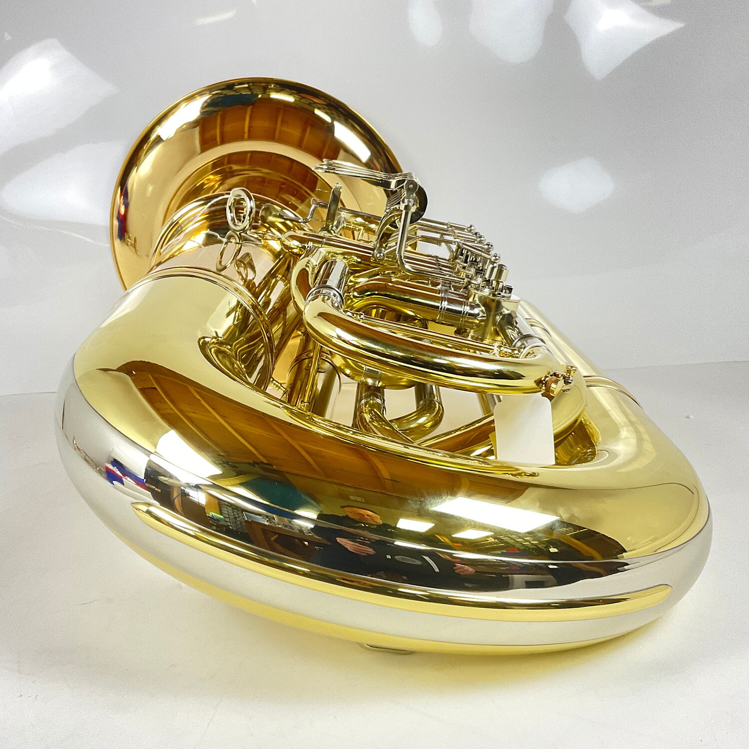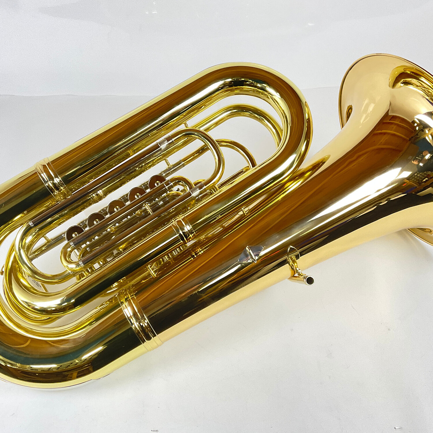Demo Eastman EBB825VG BBb tuba (SN: Y2400860) in lacquer with facgtory hard-shell case. 19" gold brass bell and 5 rotor valves of .748/.787" bore. Takes American shank tuba mouthpiece. Tuba is in nearly new condition.