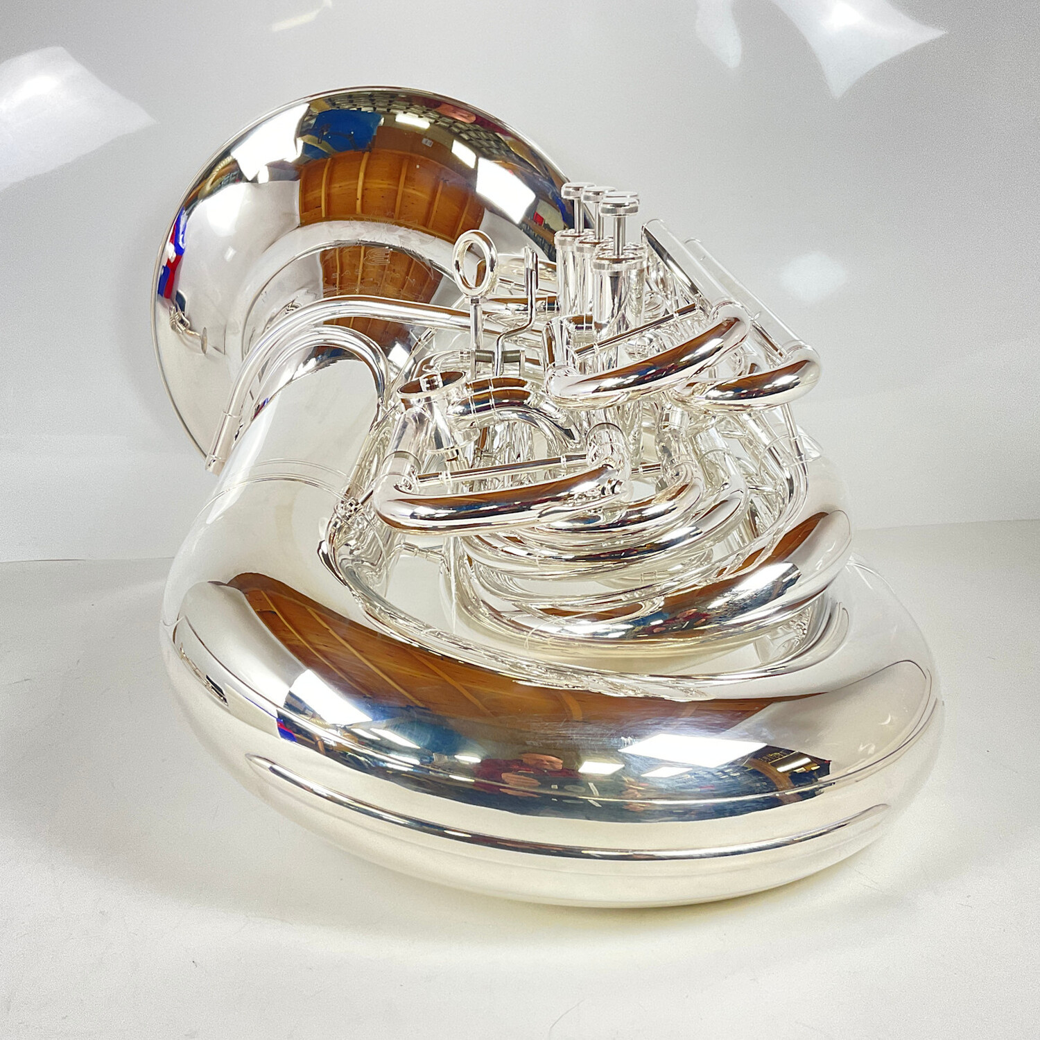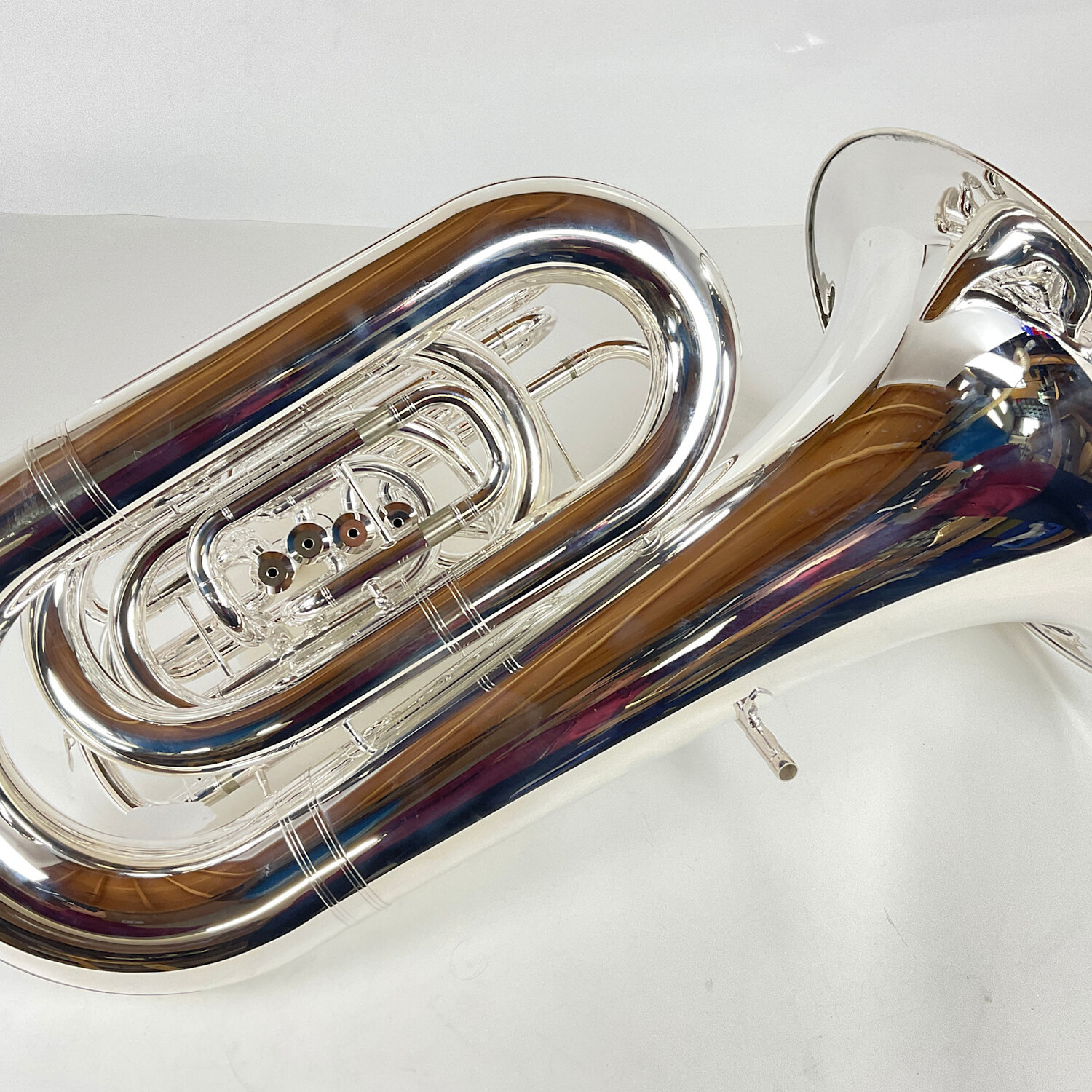 Used Eastman EBC632S CC tuba (SN: Y2400684) in silver with factory Hard-shell case. 20" upright bell and 4 front action pistons of .687" bore. Takes American shank tuba mouthpiece. This tuba is in nearly new condition. Some faint scratches in lower back of the bell that might not show up on the pictures.