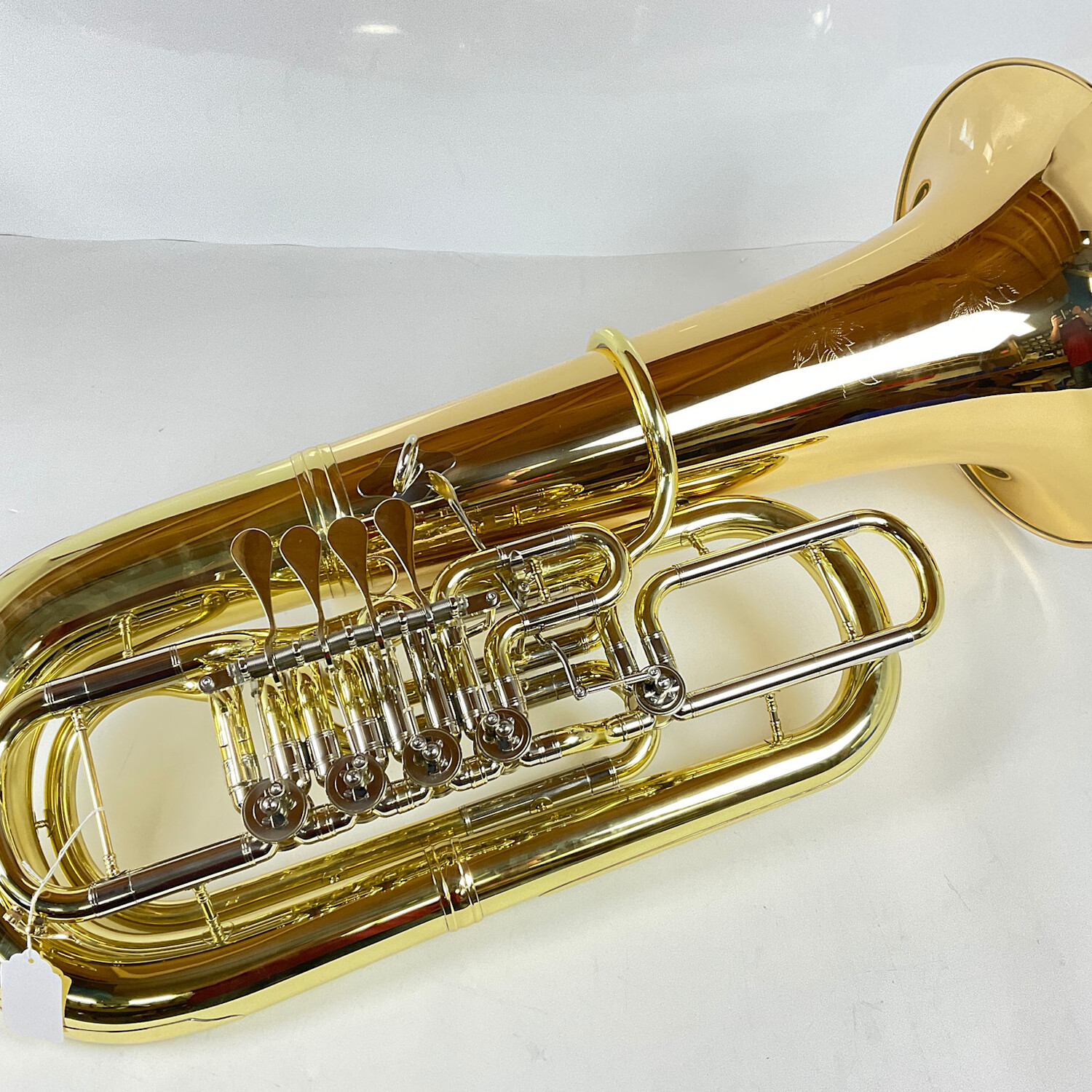 This demo tuba has had a dent repaired on the bell.