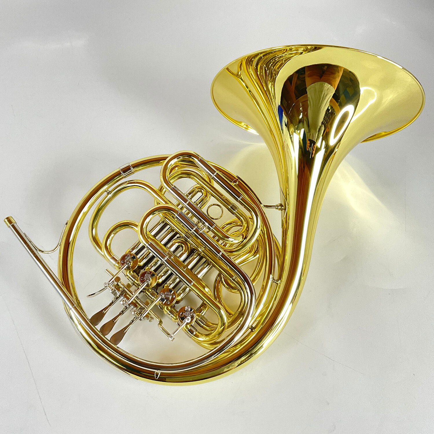 Demo Eastman EFH463 F/Bb double french horn in lacquered yellow brass. Instrument features a Geyer wrap, . 468" bore, mechanical linkage, and adjustable finger hook. Horn is in very good condition apart from minor surface imperfections. Includes original fixed bell case.