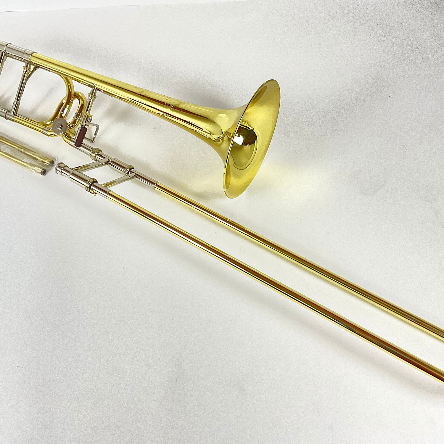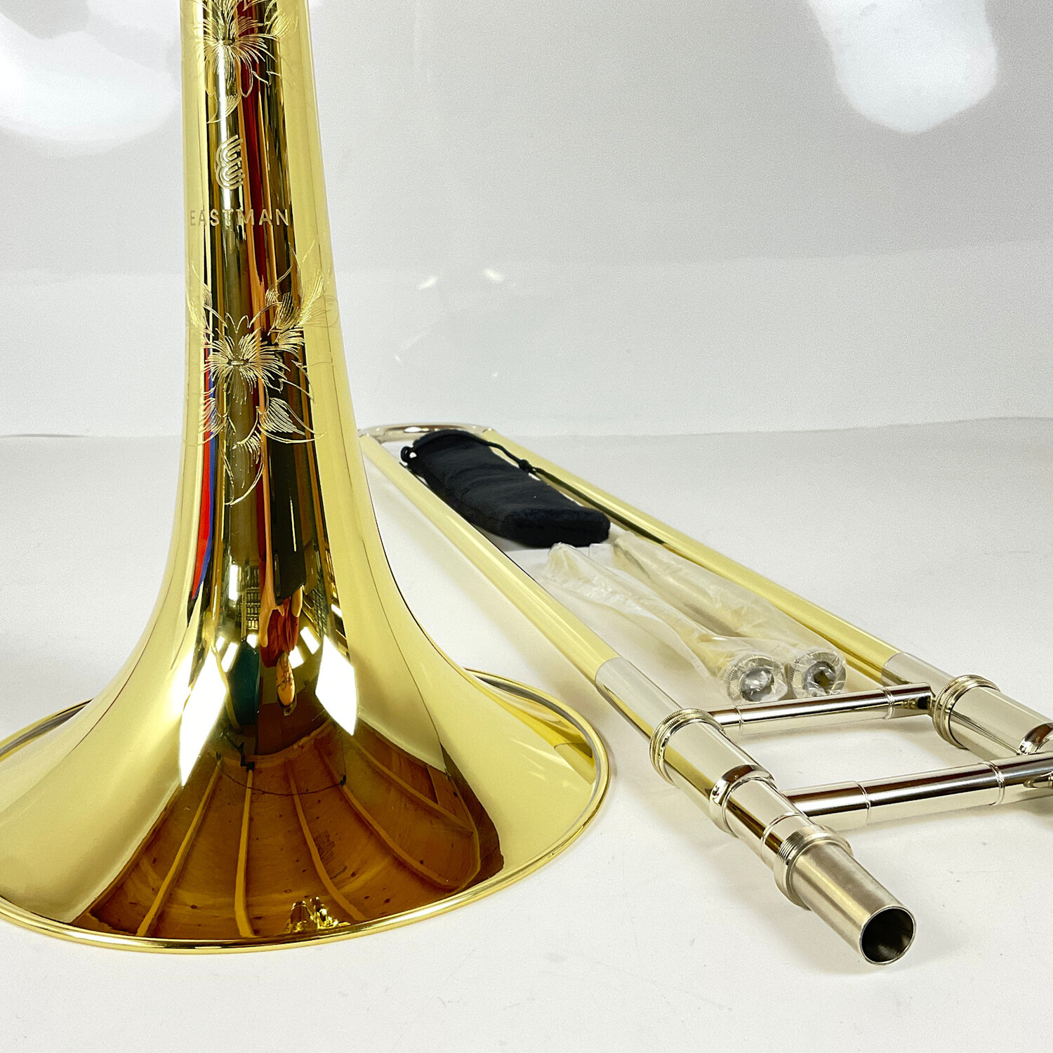 Demo Eastman ETB828 Bb/F tenor trombone in lacquer finish. Features include a .547" yellow brass handslide, 8.5" yellow brass bell, open wrap rotary valve section, removable bell section, and interchangable leadpipe system. Instrument is in excellent condition apart from minor surface scratching. Includes original Eastman case and nos. 1, 2, and 3 leadpipes.