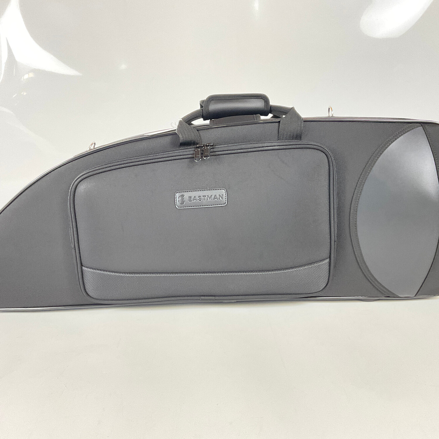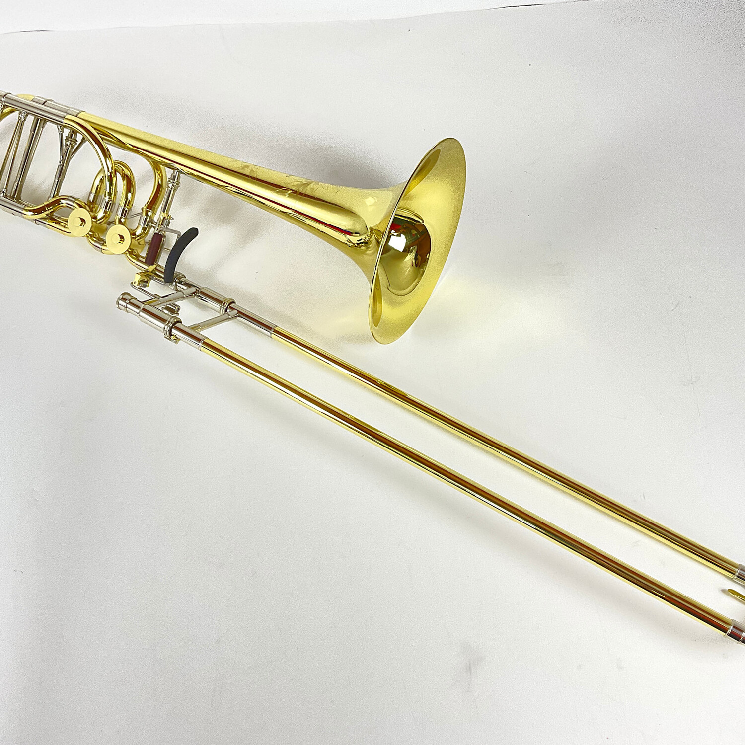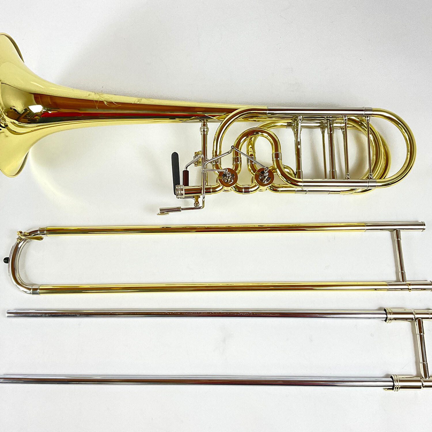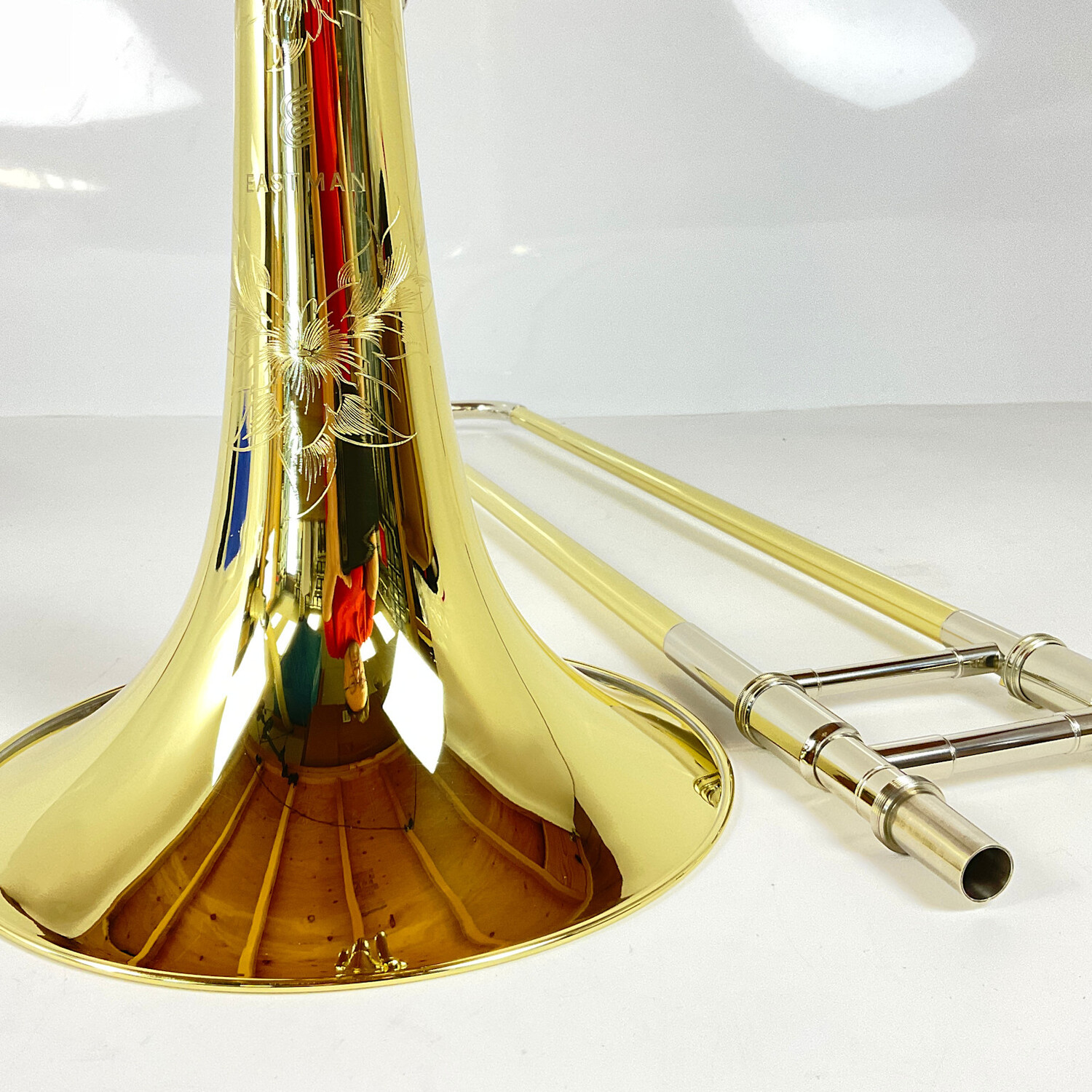 Used Eastman ETB848 Bb/F/Gb/D bass trombone in lacquer finish. Features include a .562" yellow brass handslide, open wrap rotary valve section, removable leadpipe system and 9.5" yellow brass bell. Instrument is exellent, like-new condition apart from minor surface scratching. Includes case and three leadpipes ("1", "2", "3").