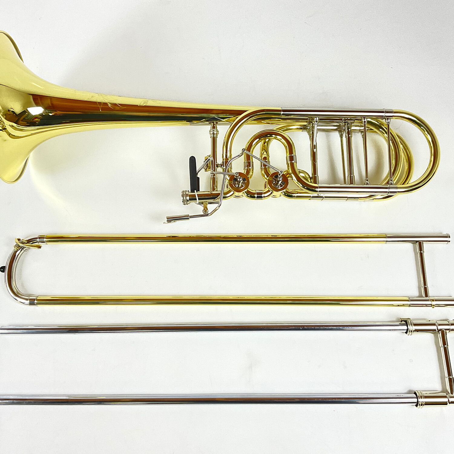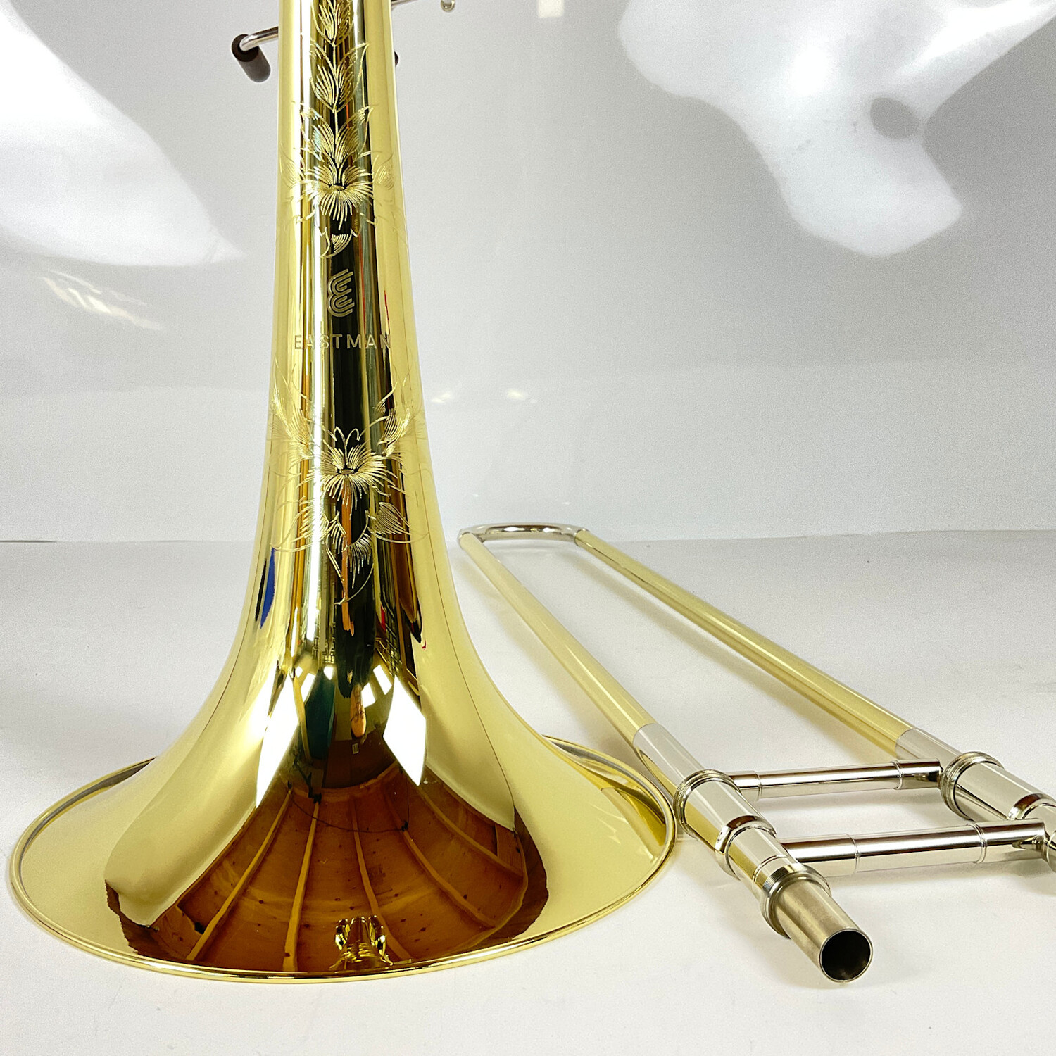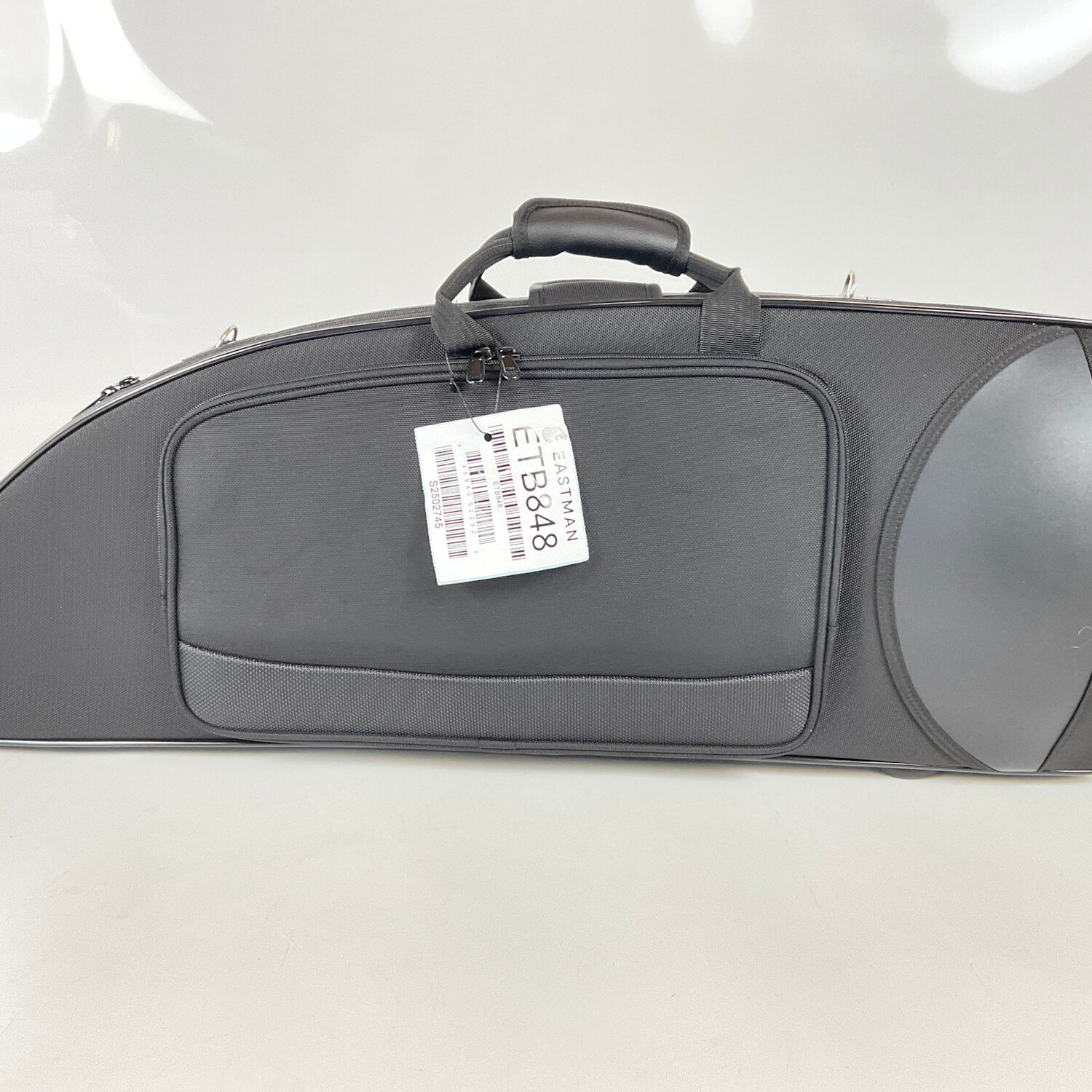 Used Eastman ETB848 Bb/F/Gb/D bass trombone in lacquer finish. Features include a .562" yellow brass handslide, open wrap rotary valve section, removable leadpipe system and 9.5" yellow brass bell. Instrument is exellent, like-new condition apart from minor surface scratching. Includes case and three leadpipes ("1", "2", "3").