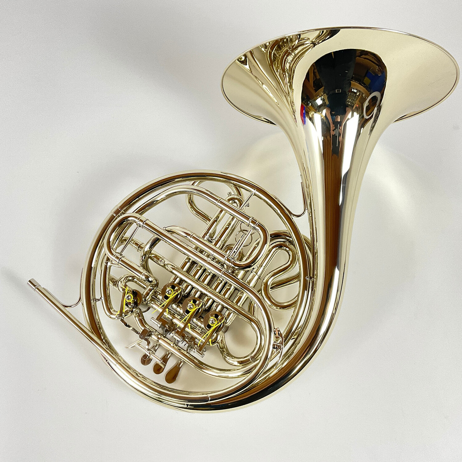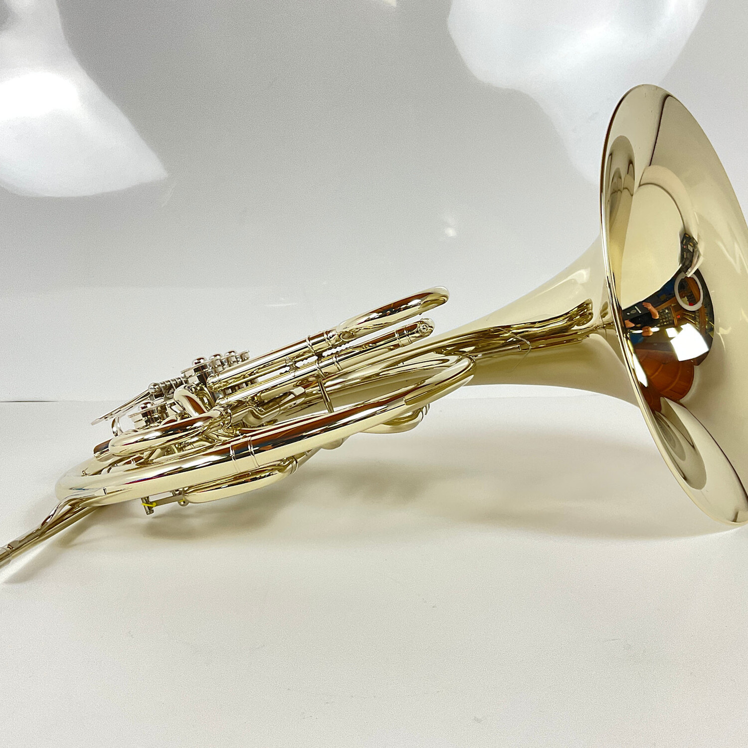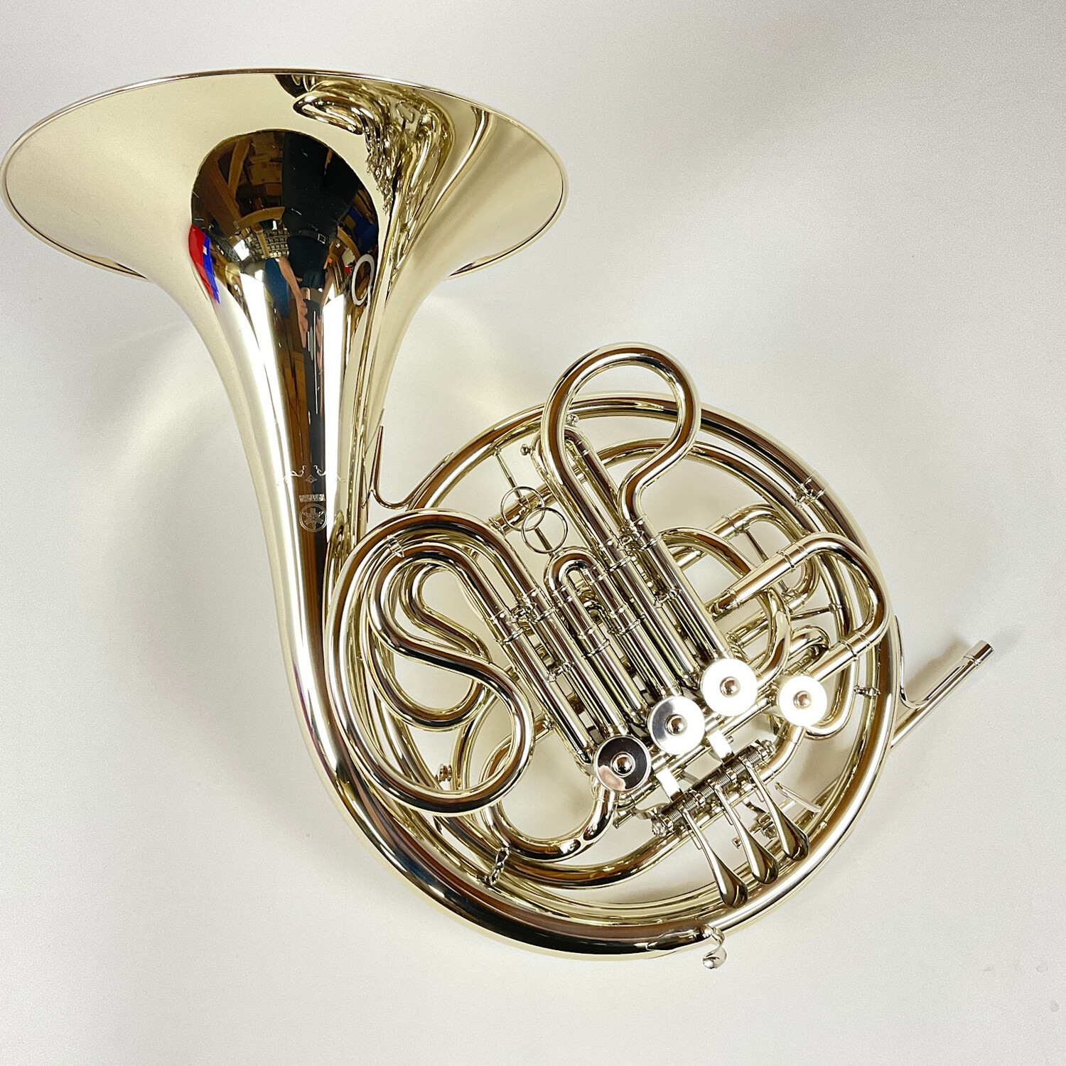 Demo Yamaha YHR-672N F/Bb Double French Horn in nickel silver. Features include 12mm (.472") bore, extra large bell, clear lacquer finish, traditional wrap, leadpipe design inherited from the iconic YHR-862, unsoldered bell rim, short-stroke 4th lever mechanism, square tuning slide crook, and revised main brace rod location. Instrument is in excellent, like-new condition apart from minor surface scratching. Includes original case and accessories.