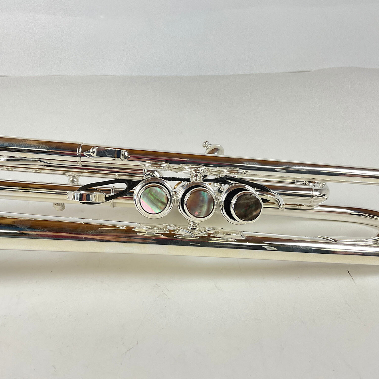 Demo Yamaha YTR-8335RSKG, ML bore (.459"), Bb trumpet in silver plate. This is a limited edition trumpet (69 from lot of 100) released at NAMM 2026. Features include a reverse leadpipe, heavy mouthpiece receiver, black mother-of-pearl valve buttons, Kangakki engraving, and phosphor bronze valve caps. Instrument is in excellent condition and has seen minimal play time. Includes original case.