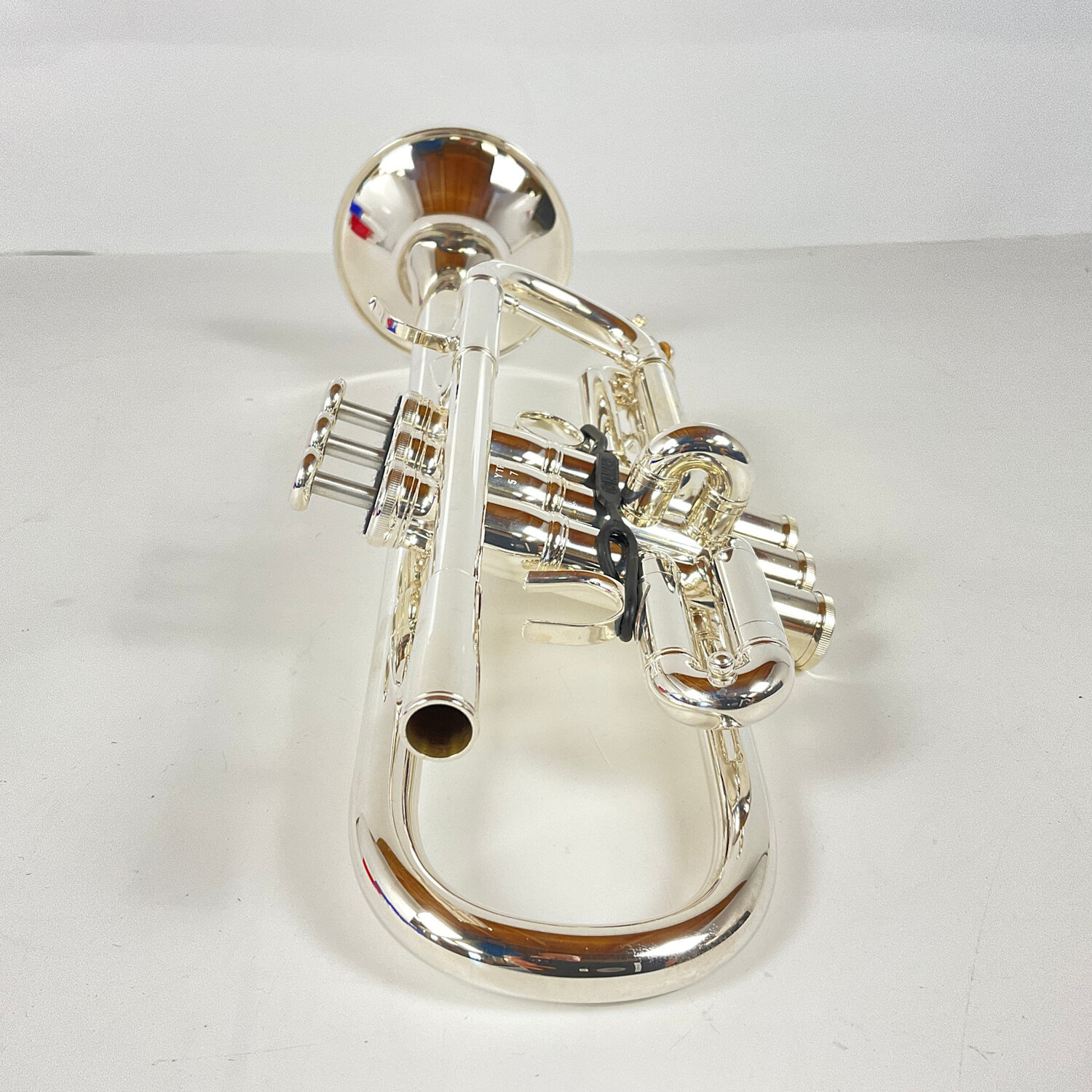 Demo Yamaha YTR-8445IIGS, large bore (.462"), C trumpet in silver plate. Features include one piece 4 7/8" gold brass bell. Instrument is in mint, like-new condition. Includes Yamaha double case and accessories.