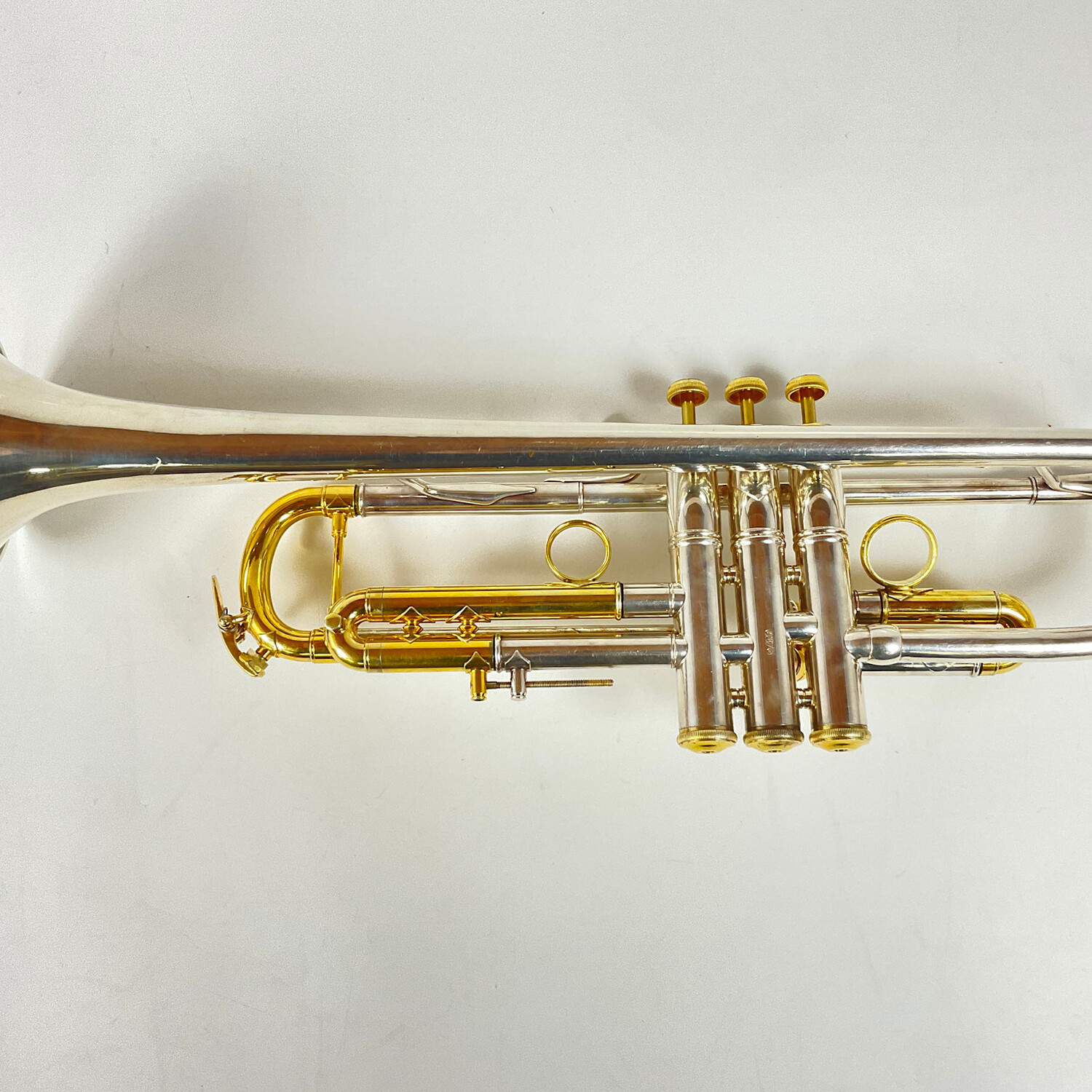Used Bach 197 Bb trumpet in silver plate with gold trim. Instrument is in good condition apart from some scratching, smaller dings, and evidence of some prior dent repair (heavy on second slide which also shows signs of soldering and a replacement pull knob). No case.