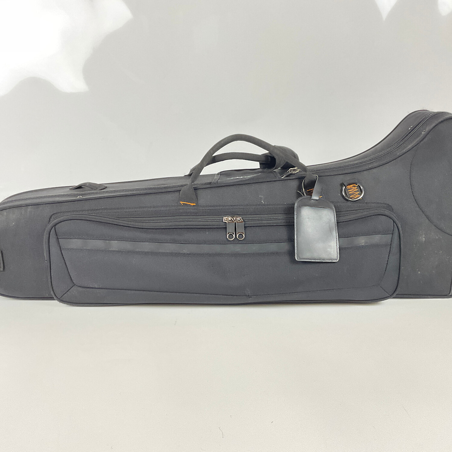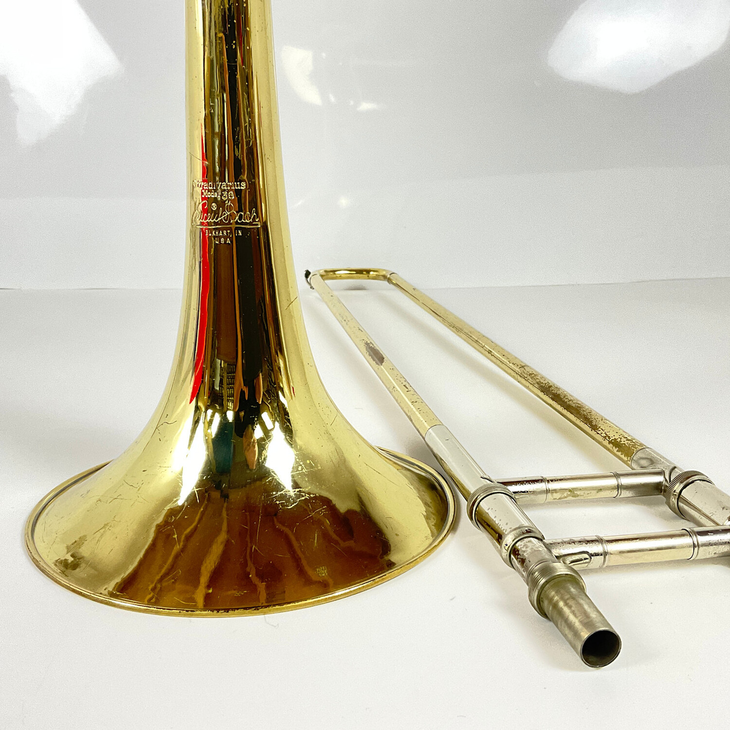 Used Bach 36K Bb/F tenor trombone in lacquer finish. Features include a .525" bore handslide, K valve, open wrap, and 8" yellow brass bell flare. Instrument is in fair condition with surface scratching and lacquer wear throughout, dings/dents throughout, evidence of prior repair to the bell flare, some wear at contact points, and some plating wear to the inner handslide. Includes Protec case.