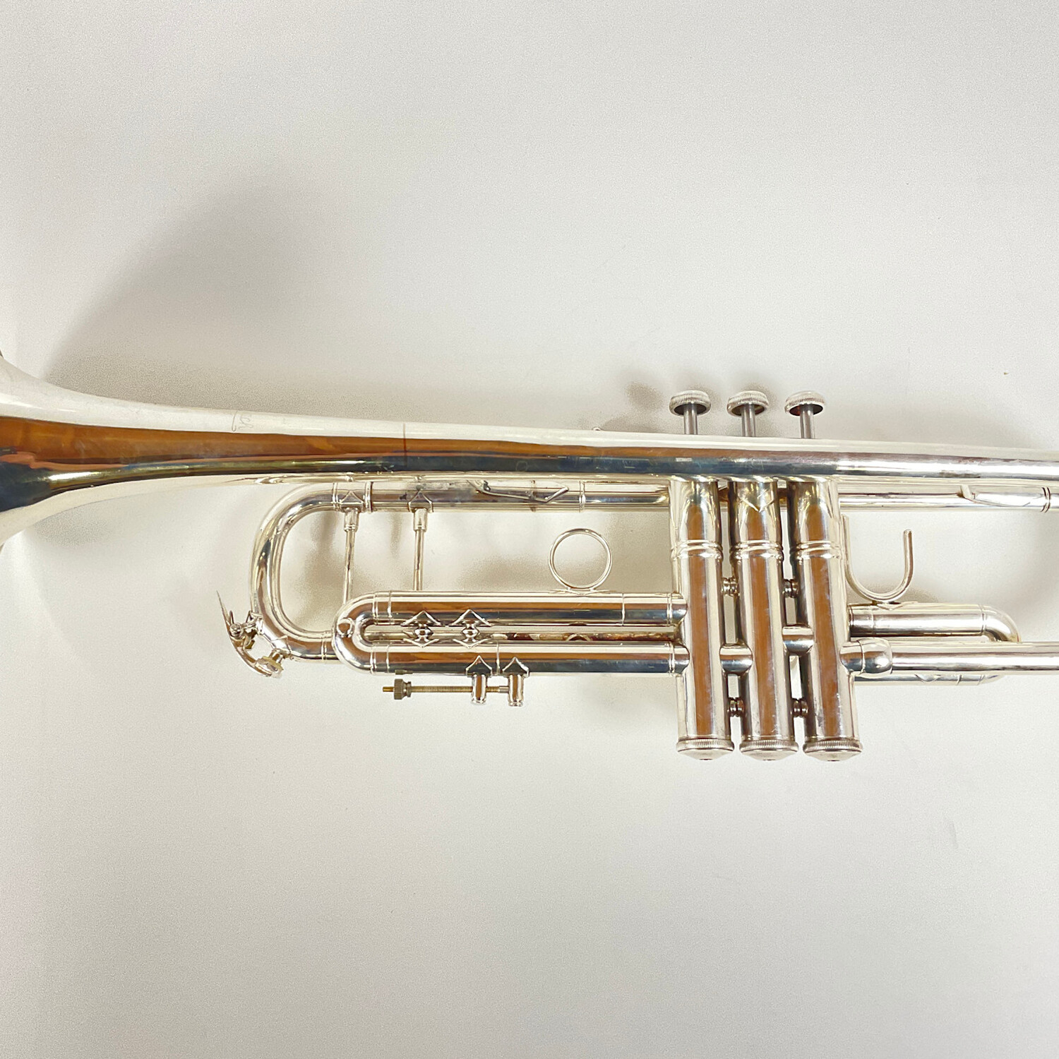 Used Bach Stradivarius Model 37, ML bore (.459"), Bb trumpet in silver plate, manufactured ca. late 1970s. Trumpet is in good/fair condition with surface scratching, dings and prior dent repair throughout, evidence that the bell has previously been removed and resoldering, and some spots of silver wear. Includes case.