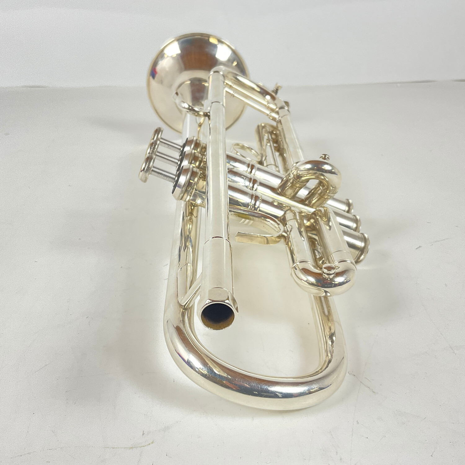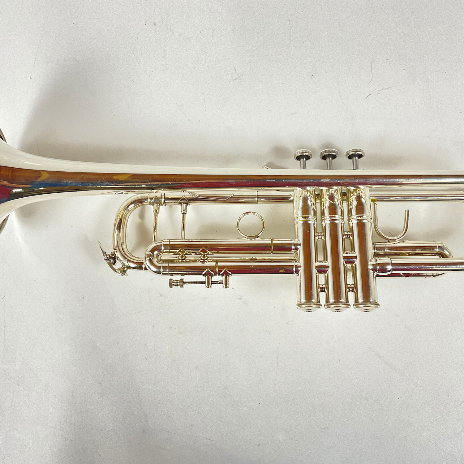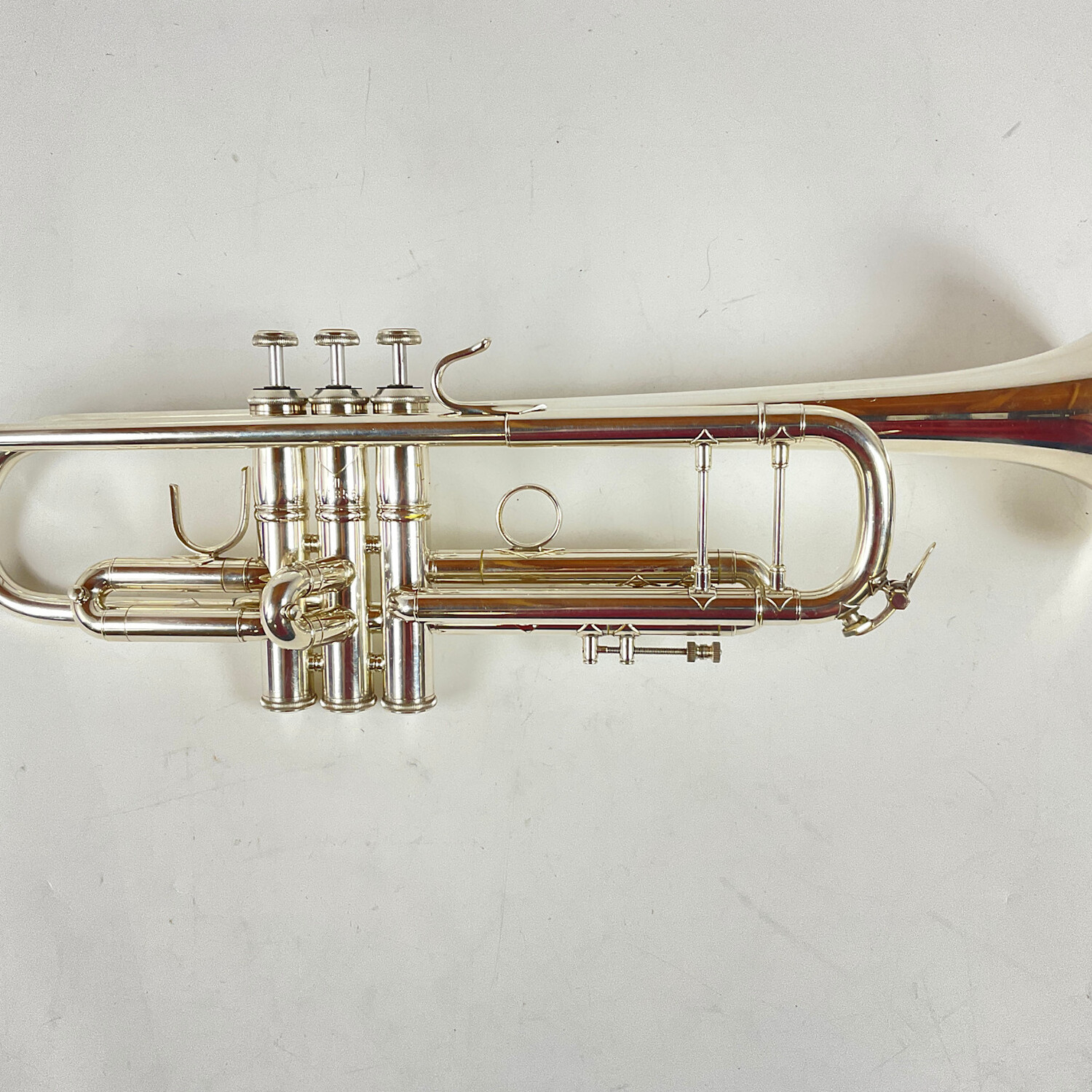 Used Bach Stradivarius Model 37, ML bore (.459"), Bb trumpet in silver plate manufactured ca. early 2000s. Instrument is in good condition apart from surface scratching, minor pitting at contact points, and some prior bell repair. Includes Bach case.