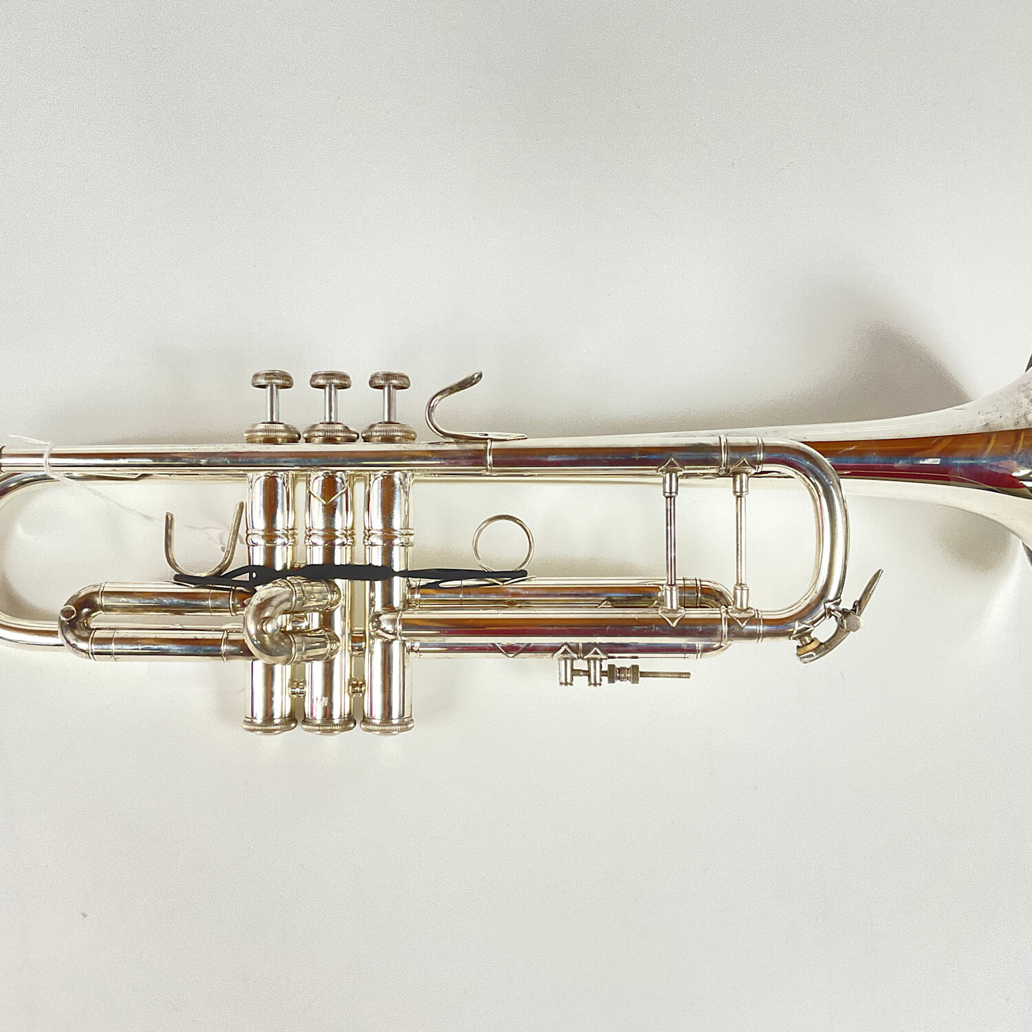 Used Bach Stradivarius Model 37, ML bore (.459"), Bb trumpet in silver plate manufactured ca. late 1990s. Instrument is in good condition apart surface scratching and some small spots of pitting. Includes Reunion Blues case.