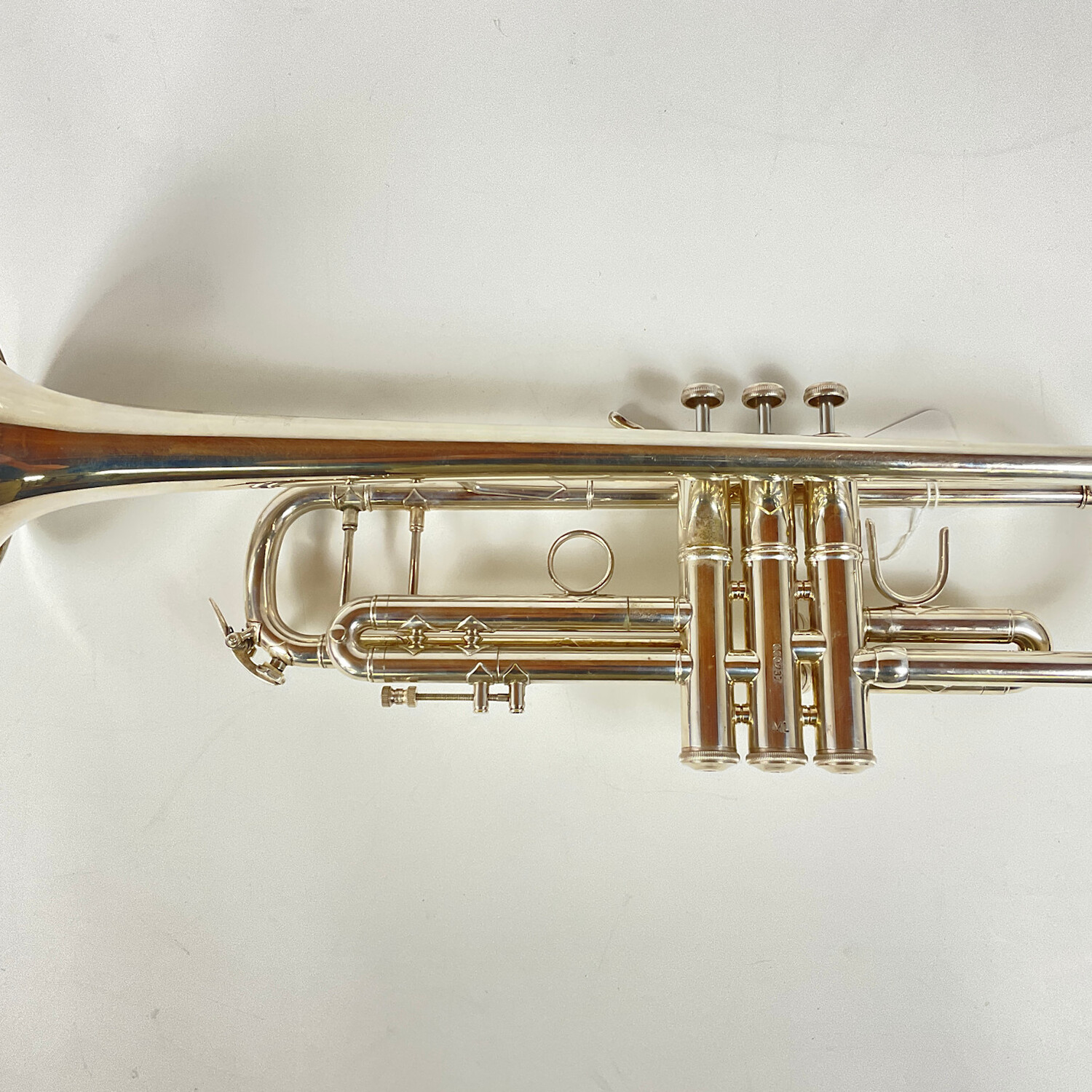 Used Bach Stradivarius Model 37, ML bore (.459"), Bb trumpet in silver plate, manufactured ca. 2000s. Instrument is in good condition apart surface scratching, bell dings, some silver wear/pitting at contact points, and some prior bell repair. Includes Bach case.