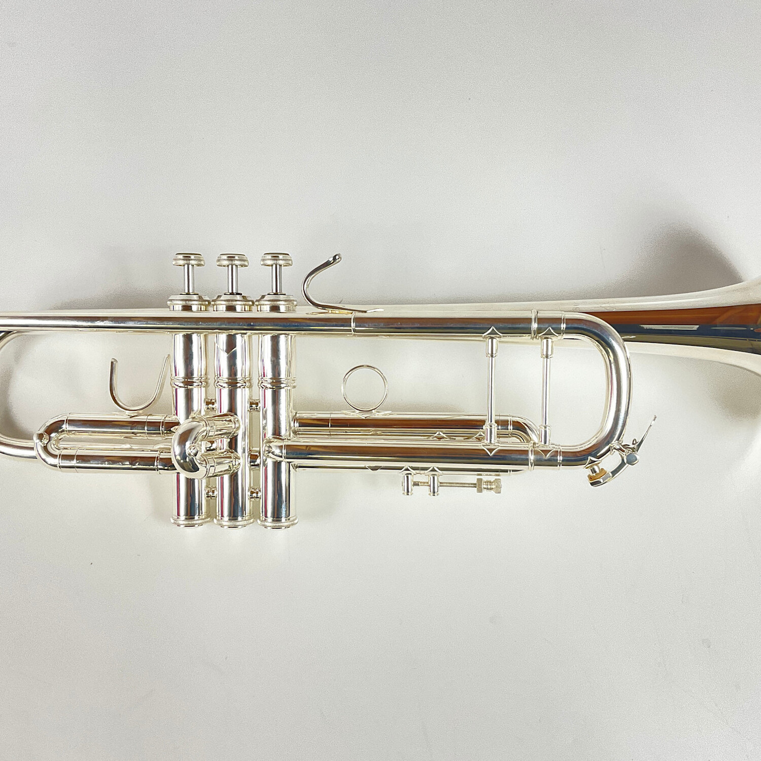 Used Bach Stradivarius Model 37, ML bore (.459"), Bb trumpet in silver plate, manufactured ca. 2000s. Instrument is in very good condition apart from minor surface scratching. Includes Bach case.