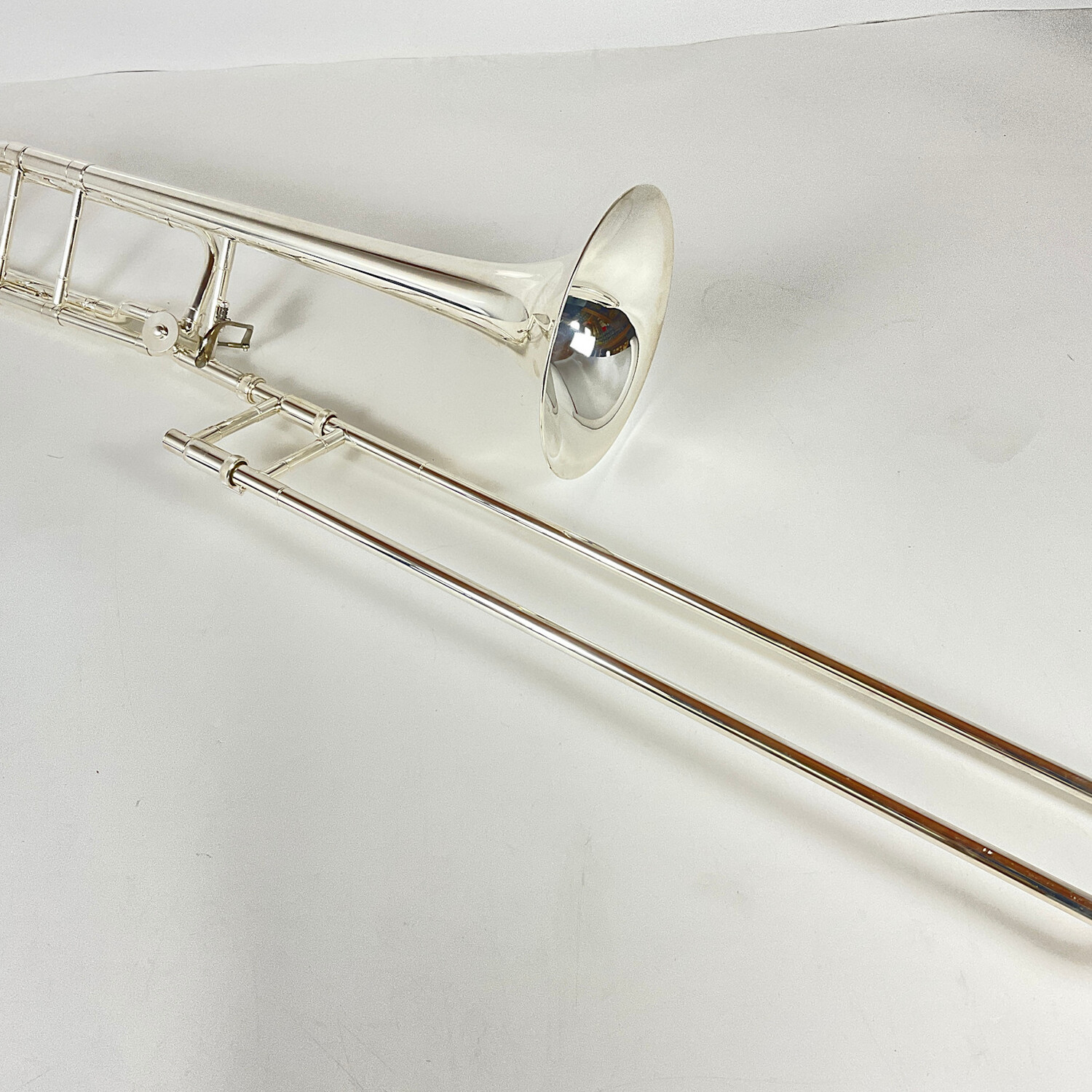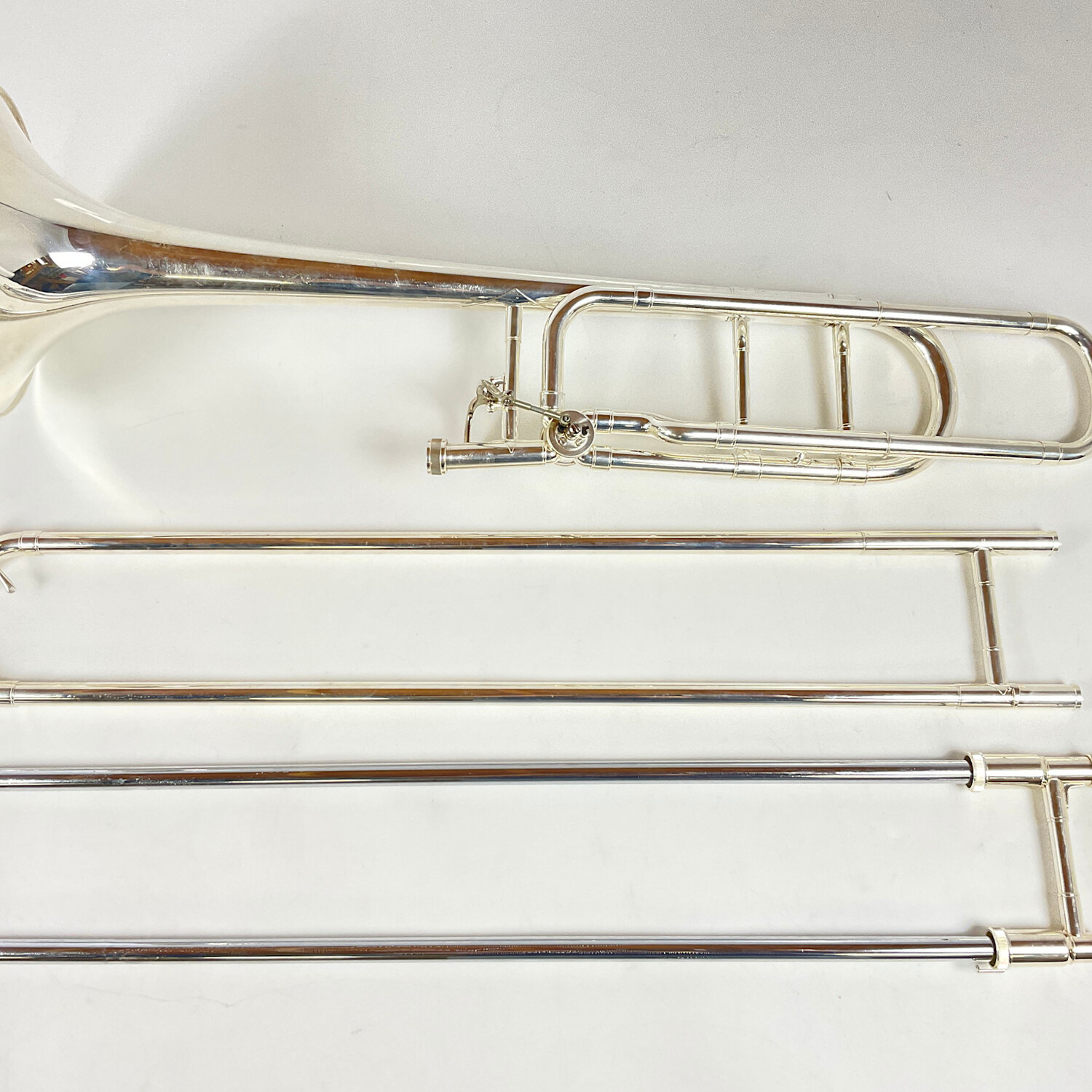 Used Bach Stradivarius model 42BOS Bb/F Tenor Trombone in silver finish. Features include a .547" bore handslide, an open wrap rotary valve section, and a 8.5" yellow brass bell. Instrument is in very good condition with minor surface scratching and a few dings. Includes case.