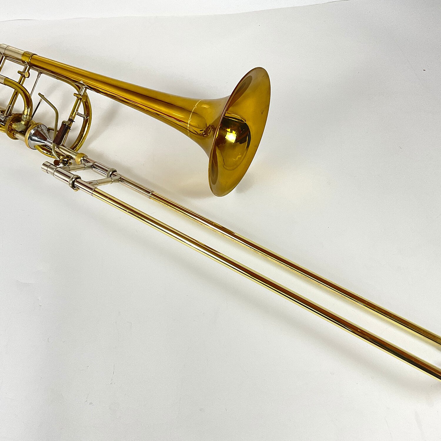 Used Bach 50T3 Bb/F/Gb/D bass trombone in lacquer finish. Features include a .562" yellow brass handslide, open wrap Thayer Axial Flow valve section, removable leadpipe, and very early gold brass Shires bell. The bell is marked Osmun from when Shires was working at Osmun and is not marked Shires as per more recent items. Trombone is in good condition apart from surface scratching, some lacquer wear, and some small dings. Includes gig bag.