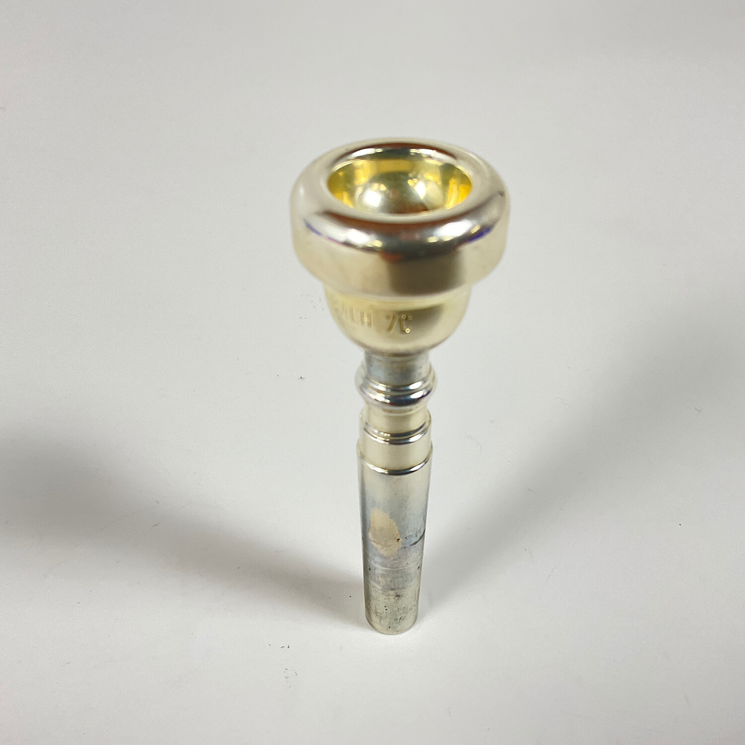 Used Bach 7C trumpet mouthpiece in silver plate. Mouthpiece is in good condition apart from some surface scratching and insertion wear.