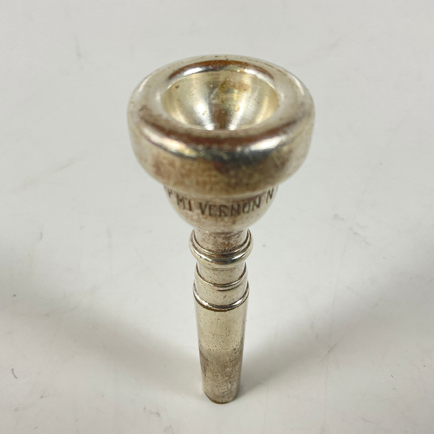 Used Bach Mt. Vernon 7C trumpet mouthpiece in silver plate. Mouthpiece has some surface scratching, a slightly out-of-round shank, and some insertion wear.