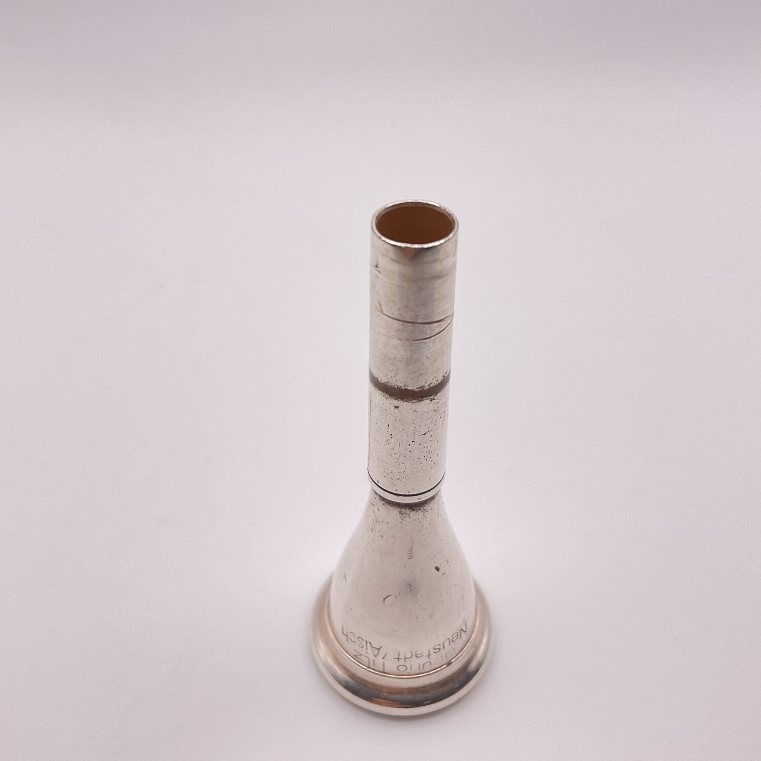 Used Bruno Tilz McWilliam 1 in silver plate. Mouthpiece has surface scratching, nicks (including in rim), and heavier insertion wear.