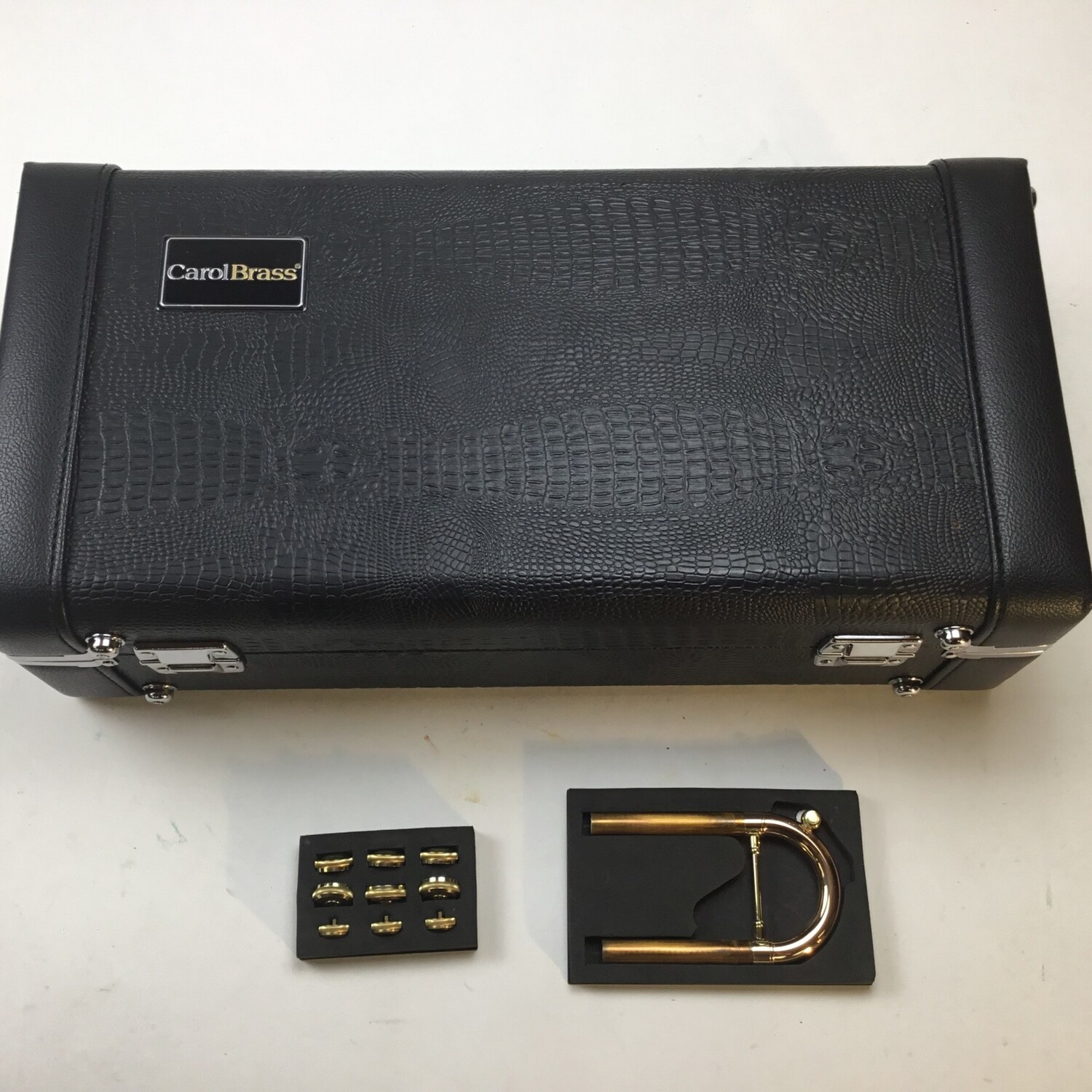 Used Carol Brass 990H-RSM medium large bore, heavy weight Bb trumpet in lacquer finish. Overall excellent condition coming with rounded and square tuning slides, 2 sets of finger buttons, 2 sets of valve caps and original case.