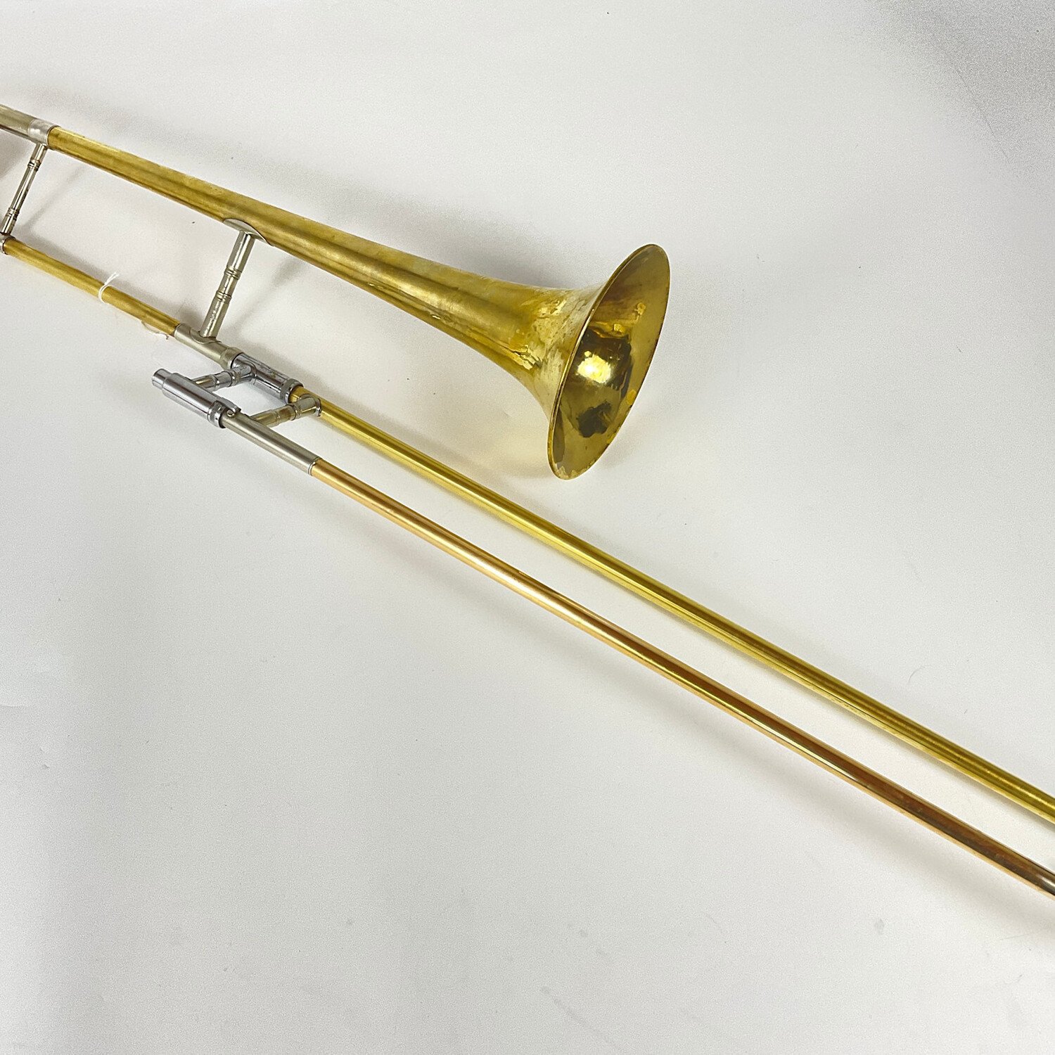 Used Conn 30H Bb Tenor trombone in lacquer finish. Features include a 0.494"/.507" hand slide and 7" bell flare. Instrument has lacquer wear, dings and dents throughout, wear throughout, metal wear at contact points, some dings/dents to the handslide crook. One side of the handslide was replaced. Doesn't include a case.