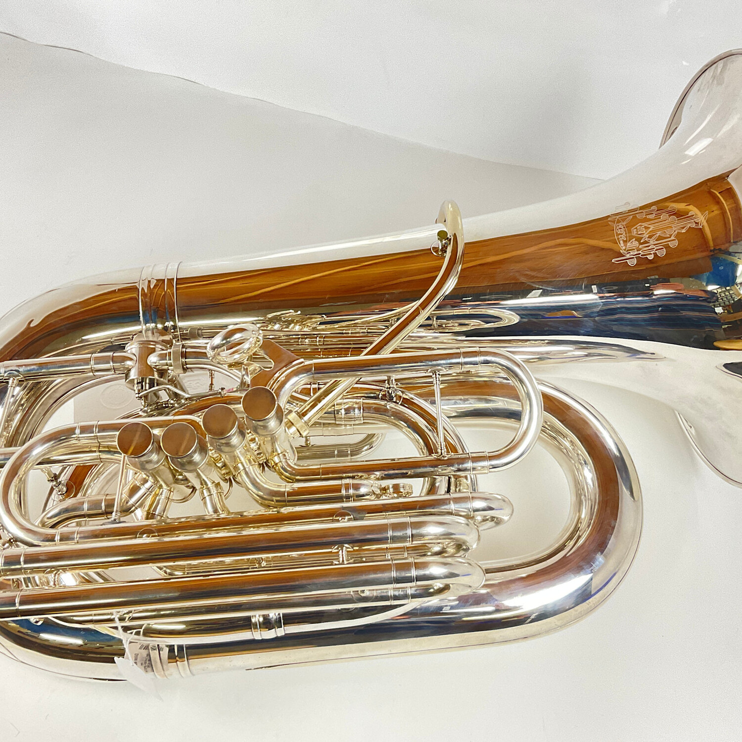 Used Conn 52J-SP CC Tuba (SN: 852982) in silver plate with gig bag. 18" upright bell and 4 front action piston so of .687" bore with right thumb operated 5th rotor valve. Classic American made CC tuba takes American shank mouthpiece but the larger Euro fits as well. Some dings and dents as can be expected on a used tuba. Plays very well!