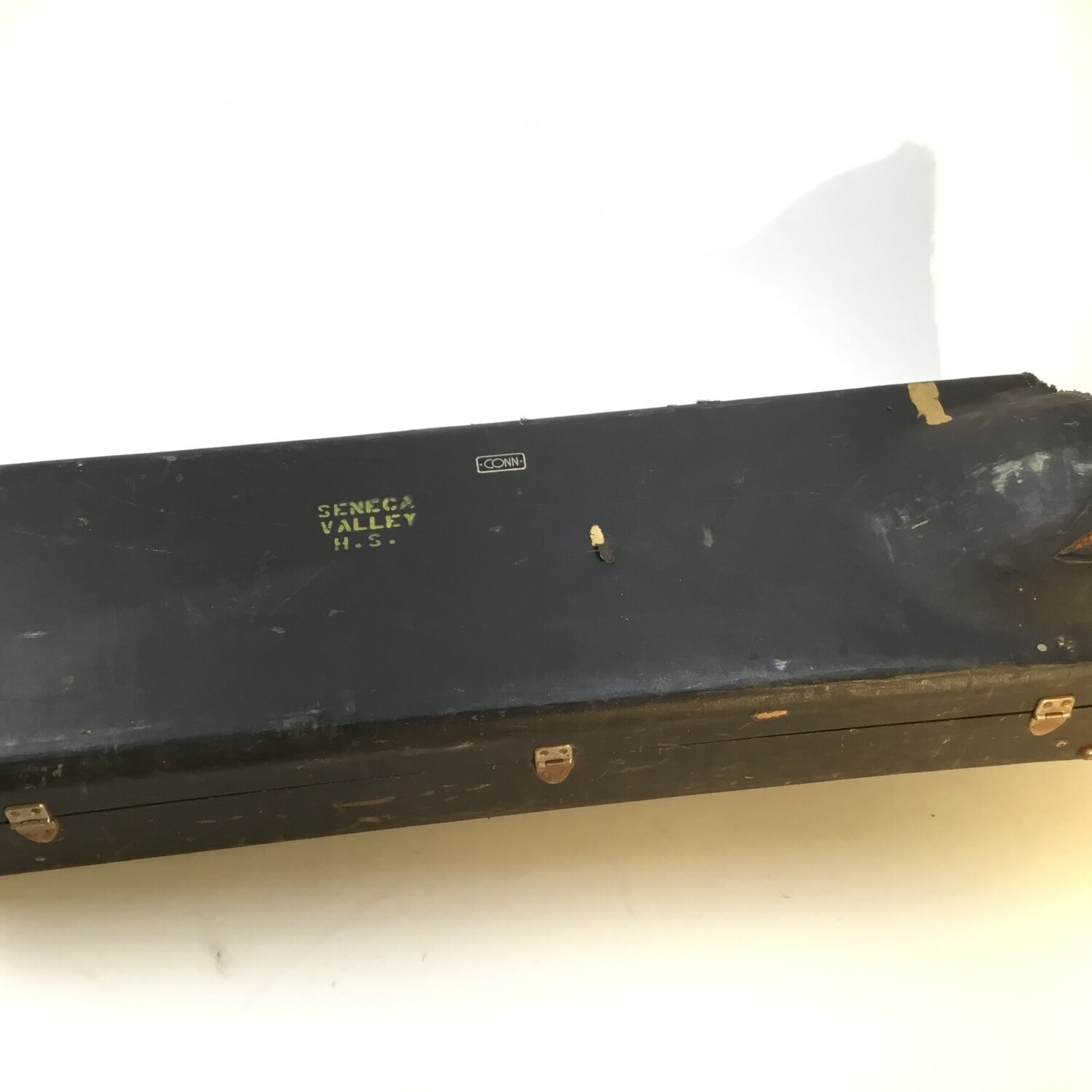 Used Conn 72H single trigger bass trombone in lacquer. Overall good condition. lacquer wear/ scratches throughout, evidence of minor bell crease and signs of some of dent repair in the bell flare.There is wear at contact points (neck), minor dents in tuni