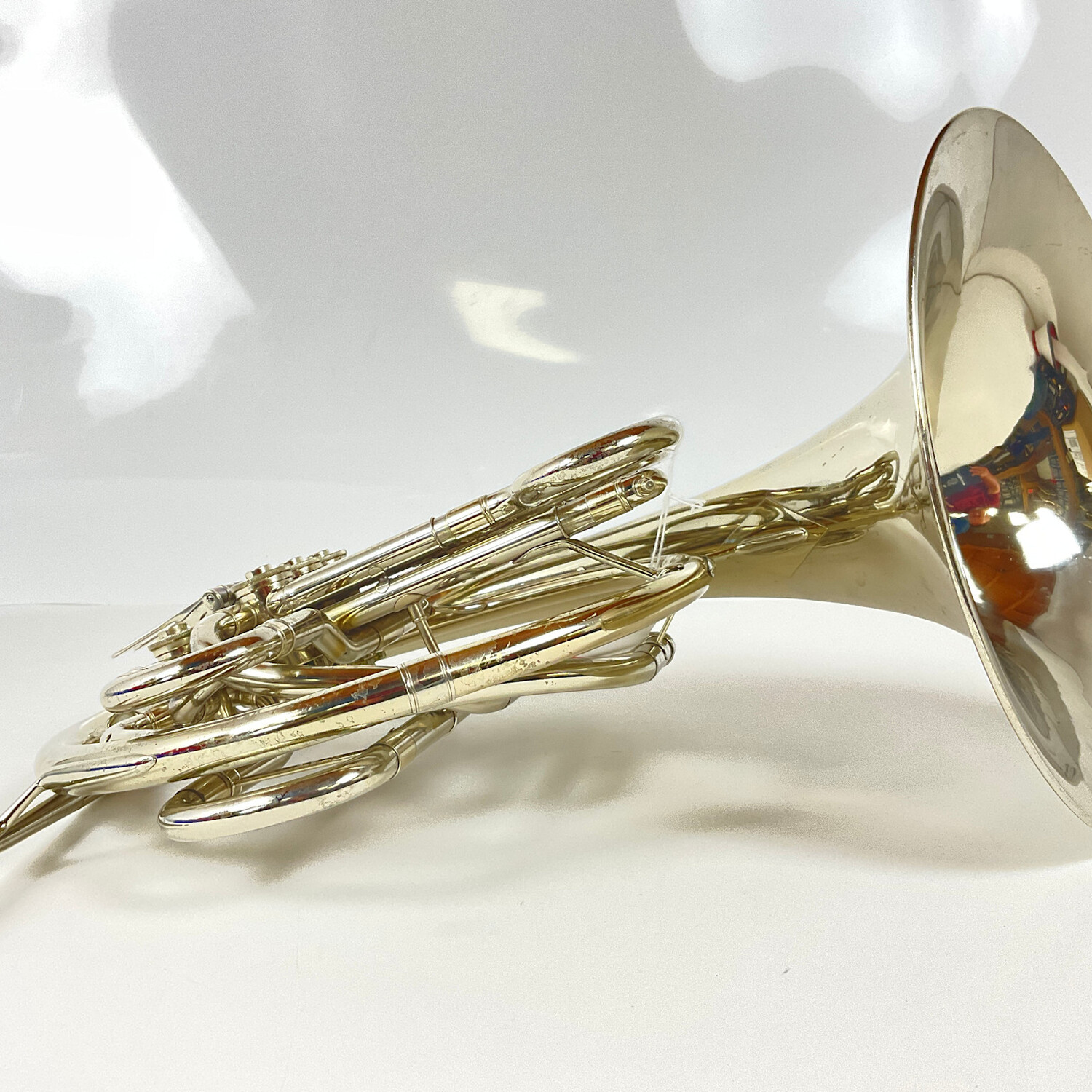 Used Conn 8D double French horn in lacquer finish. Features include a kruspe wrap, .468" bore, nickel silver constructions, and a detachable, large throat bell. Instrument is in good condition apart from surface scratching, some lacquer wear, and some dings/dents. The main tuning slide has been lengthened aftermarket. Compression is good at 1.0 on the F side and 2.0 on the Bb side. Includes original case and some accessories.