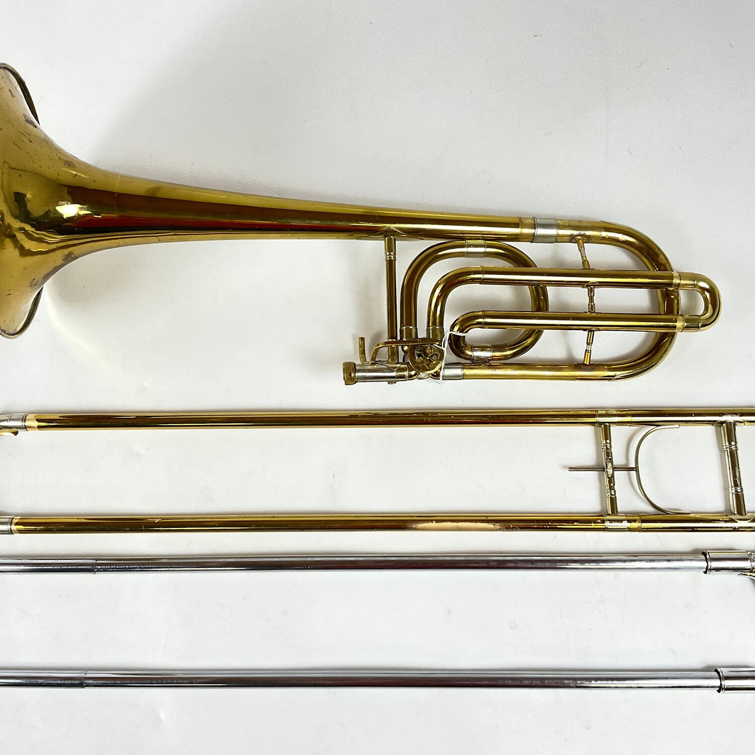 Used Conn "Elkhart" 70H Bb/F bass trombone in lacquer finish. Features include a .562" handslide, rotary valve section, in-slide tuning, and 9.5" bell. Insturment is in good/fair condition with some surface scratching and lacquer wear throughout, some evidence of prior dent/soldering repair, and some spots of plating wear to the inner handslide tubes. Includes case.
