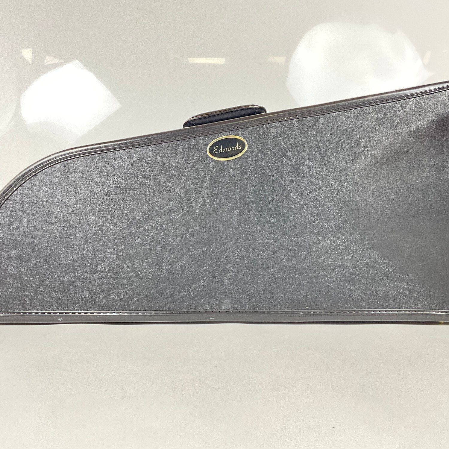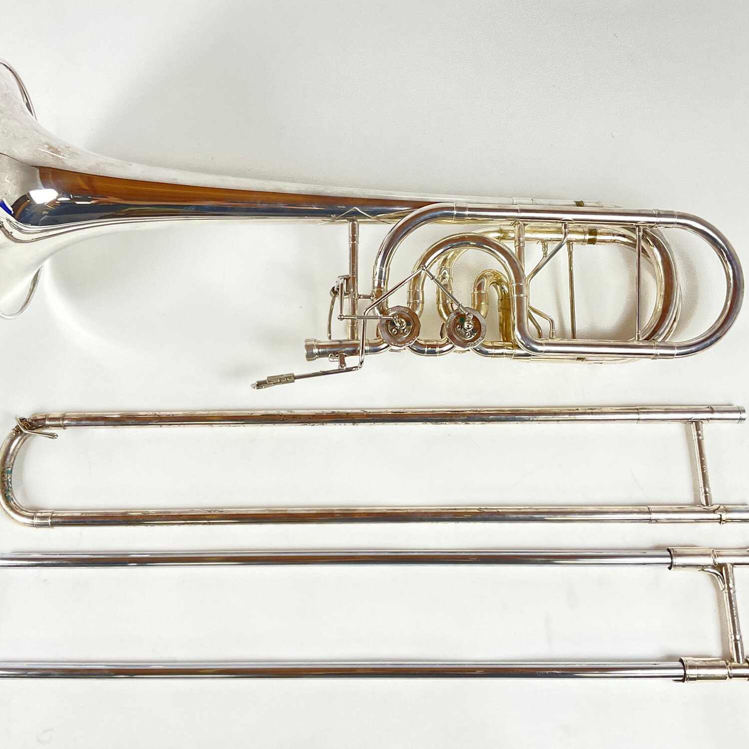 Used Conn/Greenhoe 62H Bb/F/Gb/D bass trombone in silver plate. Features include .562" handslide, open wrap Greenhoe valve section, and 9.5 yellow brass bell flare. Instrument is in excellent condition apart from minor surface scratching. Includes older Edwards case. This is a rare and desirable instrument.