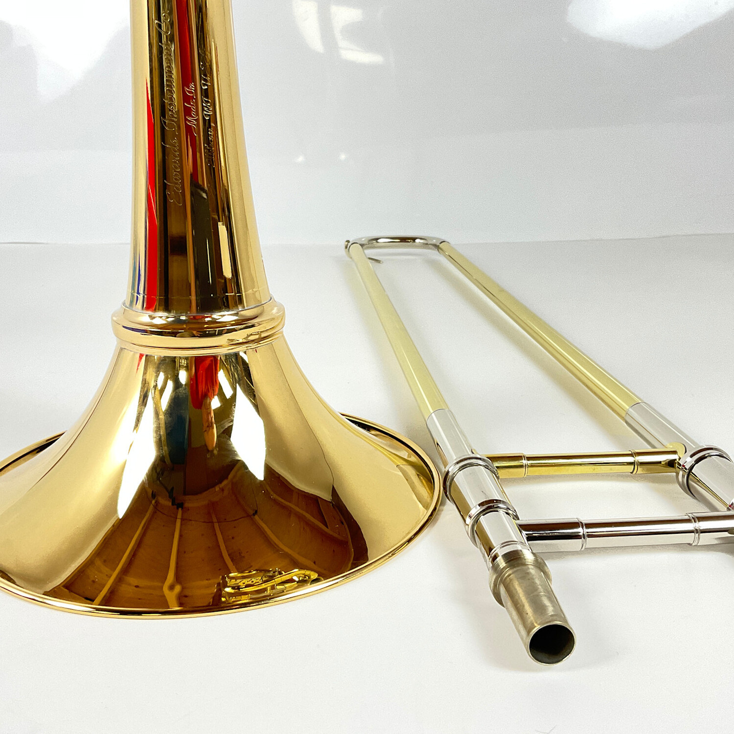 Used Edwards T350-E Bb/F tenor trombone in lacquer finish. Features include a .547" yellow brass T-BCN47 handslide, open wrap axial flow valve section, yellow brass single radius main tuning slide, removable leadpipe system, Harmonic Bridge, and detachable "Oft Model" gold brass bell flare. Instrument is in good condition apart from surface scratching and lacquer wear. Includes T2 brass leadpipe. Includes detachable bell Bach-branded Gard case.