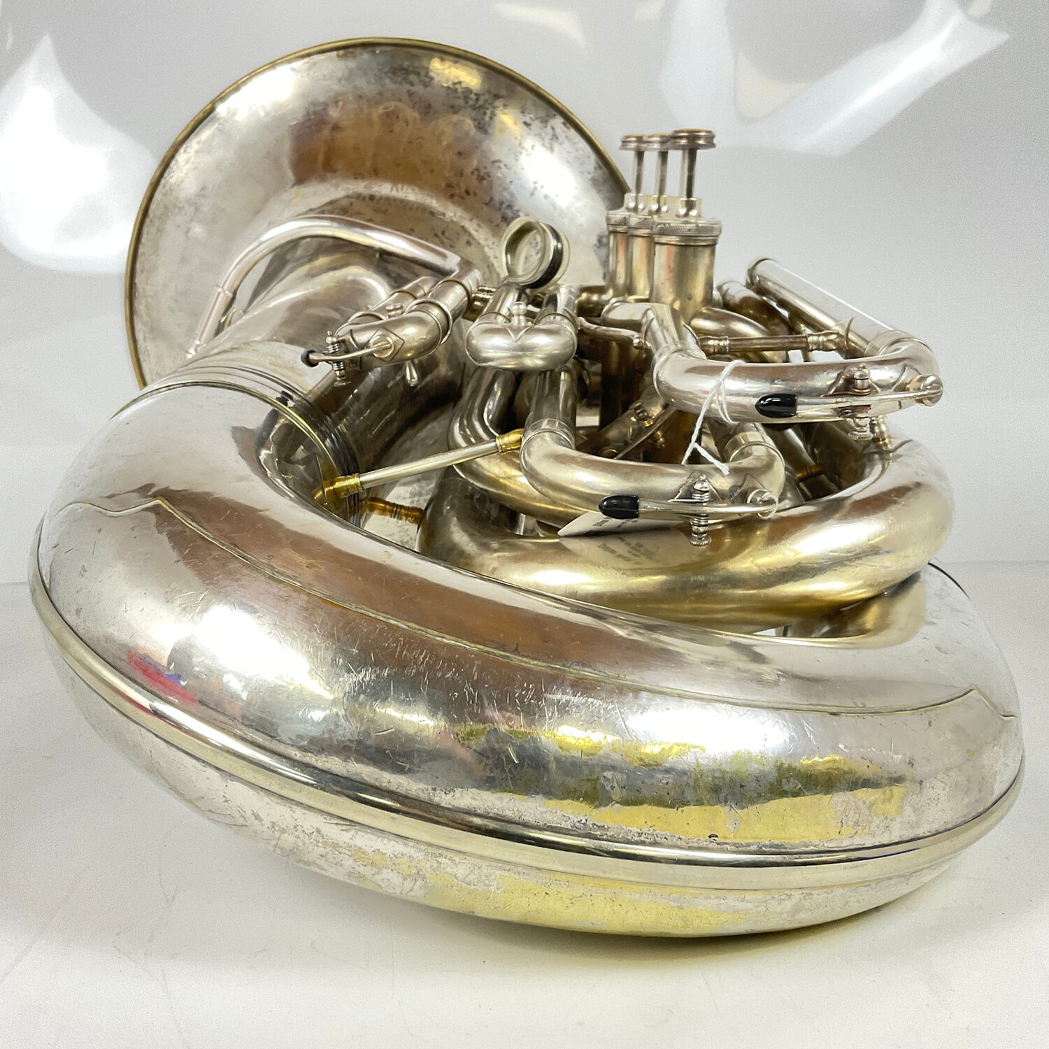 Used HN White King BBb Tuba (SN: 132767) in silver, no case. 20" upright bell, 33" tall, and 4 front action pistons of .750" bore. Takes American shank tuba mouthpiece. 4th valve is a longer "1,2&3" length that works great for the lower register playing. Valves have been replated. This big sounding tuba was originally bell front, but this replacement upright bell is vintage correct. Plays in tune at A=440.