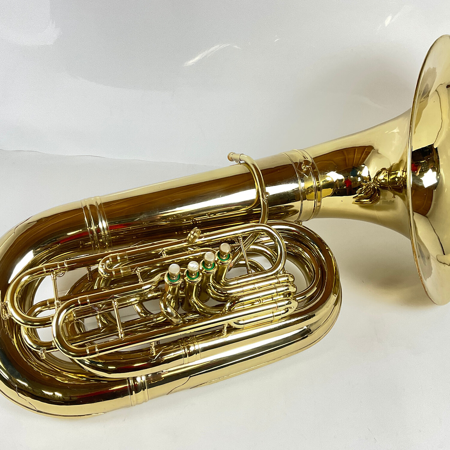 Used King 1241 BBb tuba (SN: 387538) in lacuqer with a hard-shell case for the body only. No Bell cases. Comes with origianl 22" flair bell front bell and and additional 22" flair upright bell. 4 front action pistons of .687" bore. Takes American shank tuba mouthpiece. Body and bell front bell have been previously overhauled and re-lacquered. This tuba sounds great. Dings, dents, scratches and lacquer wear as can be seen in the pictures.