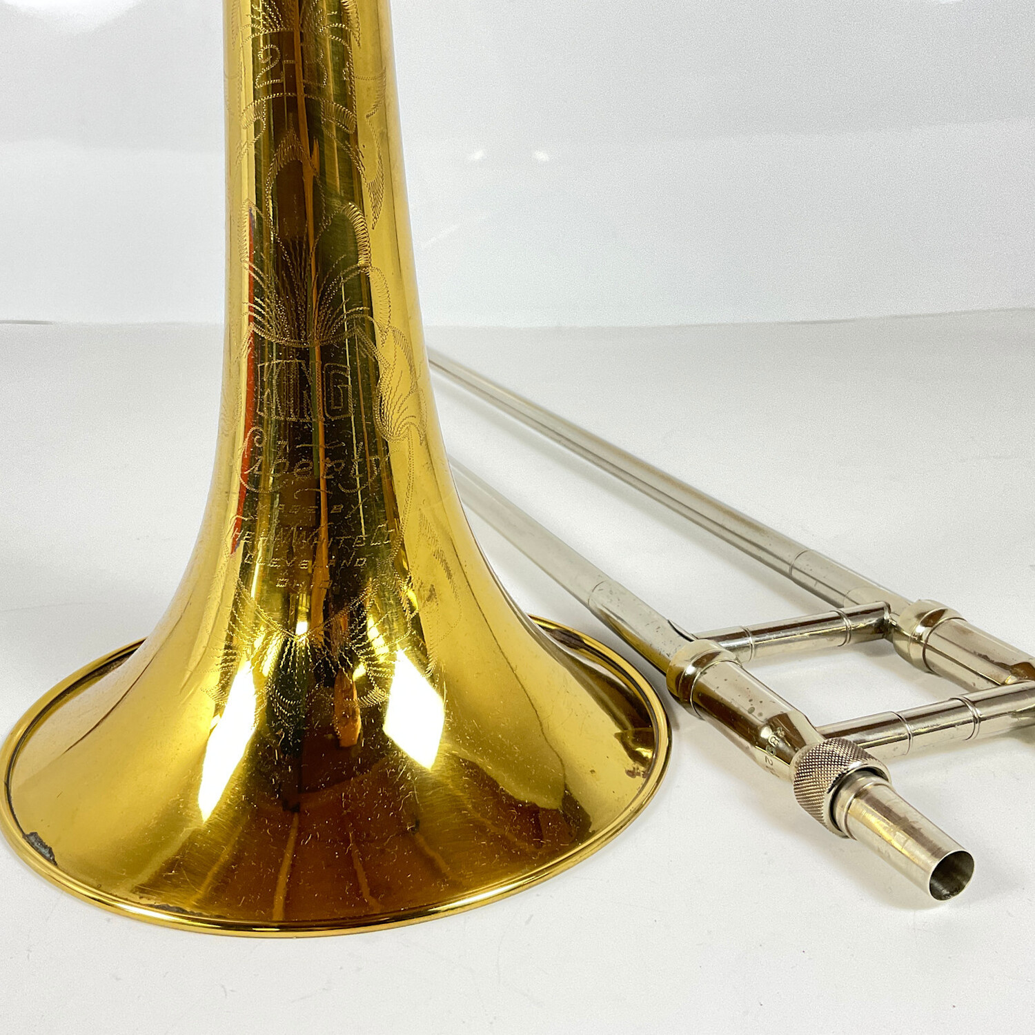 Used King "Liberty" 2B Bb Tenor Trombone in lacquer finish, manufactured ca. 1947. Features include a .481"-491” dual bore lightweight handslide and a 7-3/8” yellow brass bell flare. Instrument is in very good condition for its age apart from surface scratching, lacquer wear/some minor pitting, and evidence of dent removal in the bell flare. Includes case.