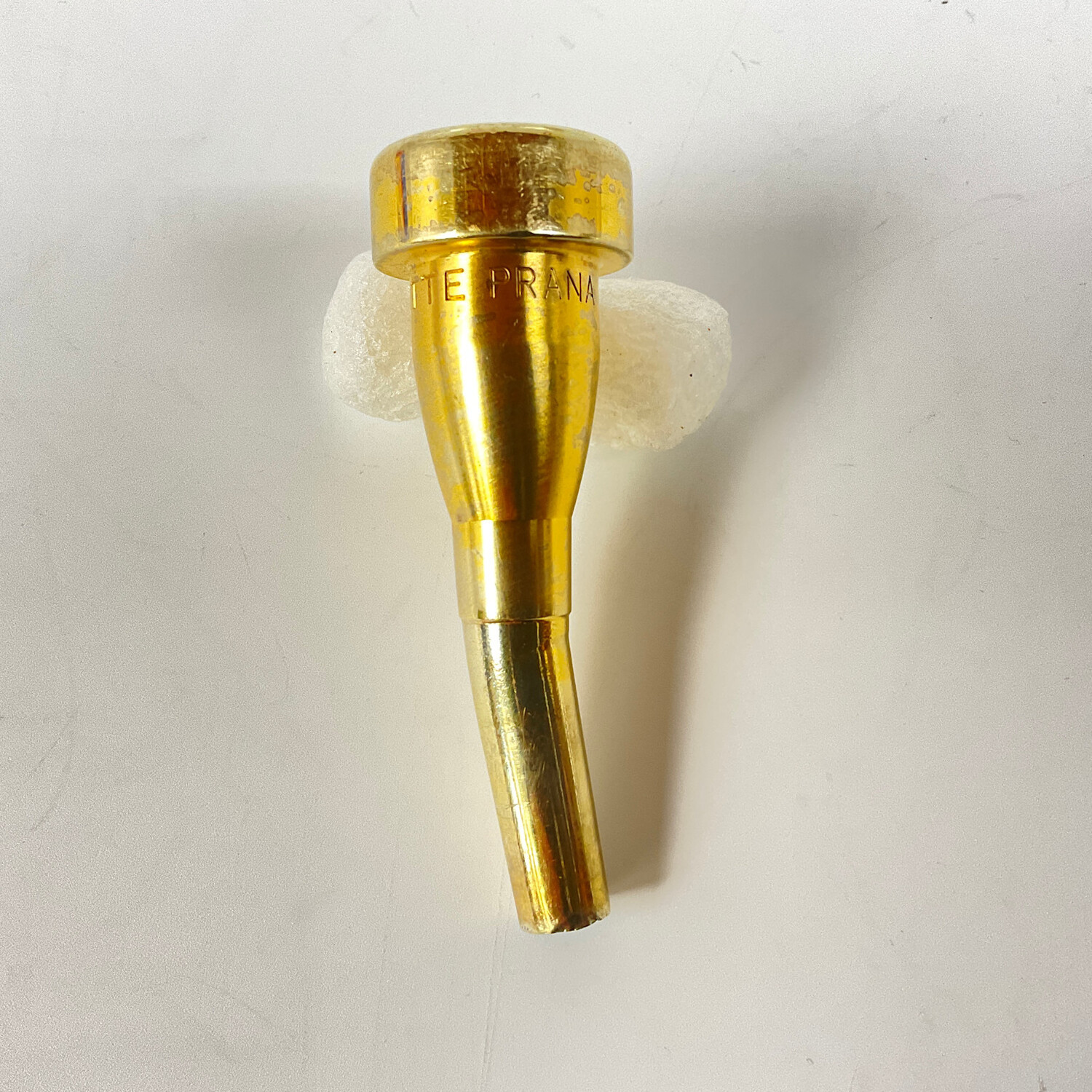 Used Monette Prana STC-1 B4S 82 Bb trumpet mouthpiece with mid shank, in gold shank. Mouthpiece has been bent for the previous player. Mouthpiece has surface scratching, nicks, and a trued shank.