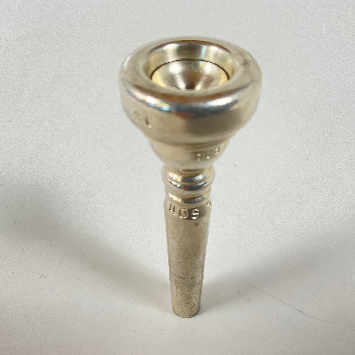 Used Reeves 40S 5/ 3C trumpet mouthpiece in silver plate. This mouthpiece includes a threaded rim and underpart. The underpart is marked 40S 5 and the rim is marked 3C. Mouthpiece is in good condition apart from some surface scratching and insertion wear.