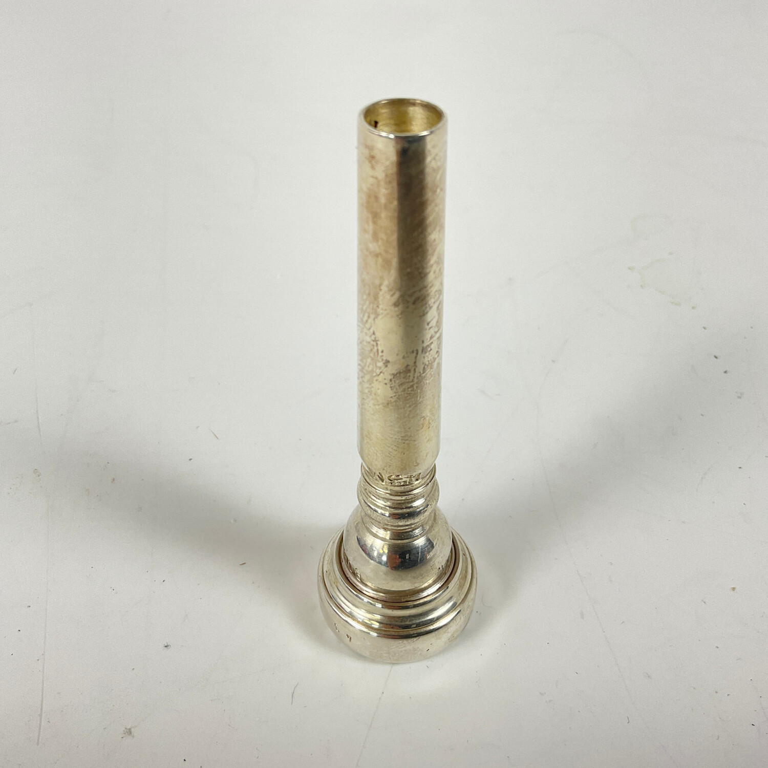 Used Reeves 43M trumpet mouthpiece in silver plate. This mouthpiece includes a threaded rim and underpart. Mouthpiece is in very good condition apart from some surface scratching and tarnish.