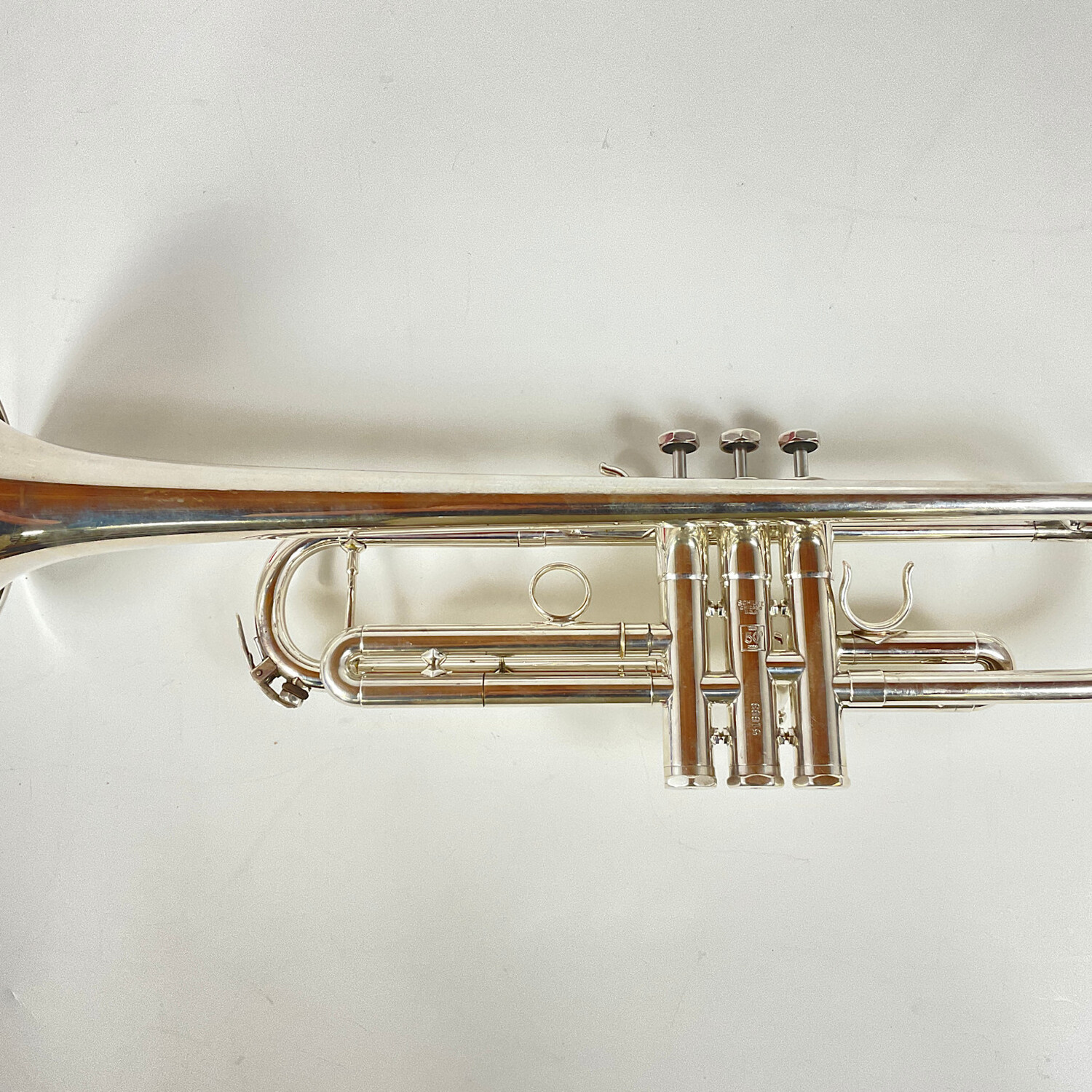 Used Schilke X3, large bore (.463"), Bb trumpet in silver plate. Instrument in good condition apart from surface scratching and some minor silver wear on the main tuning slide where a brace was added. Includes Yamaha double case.