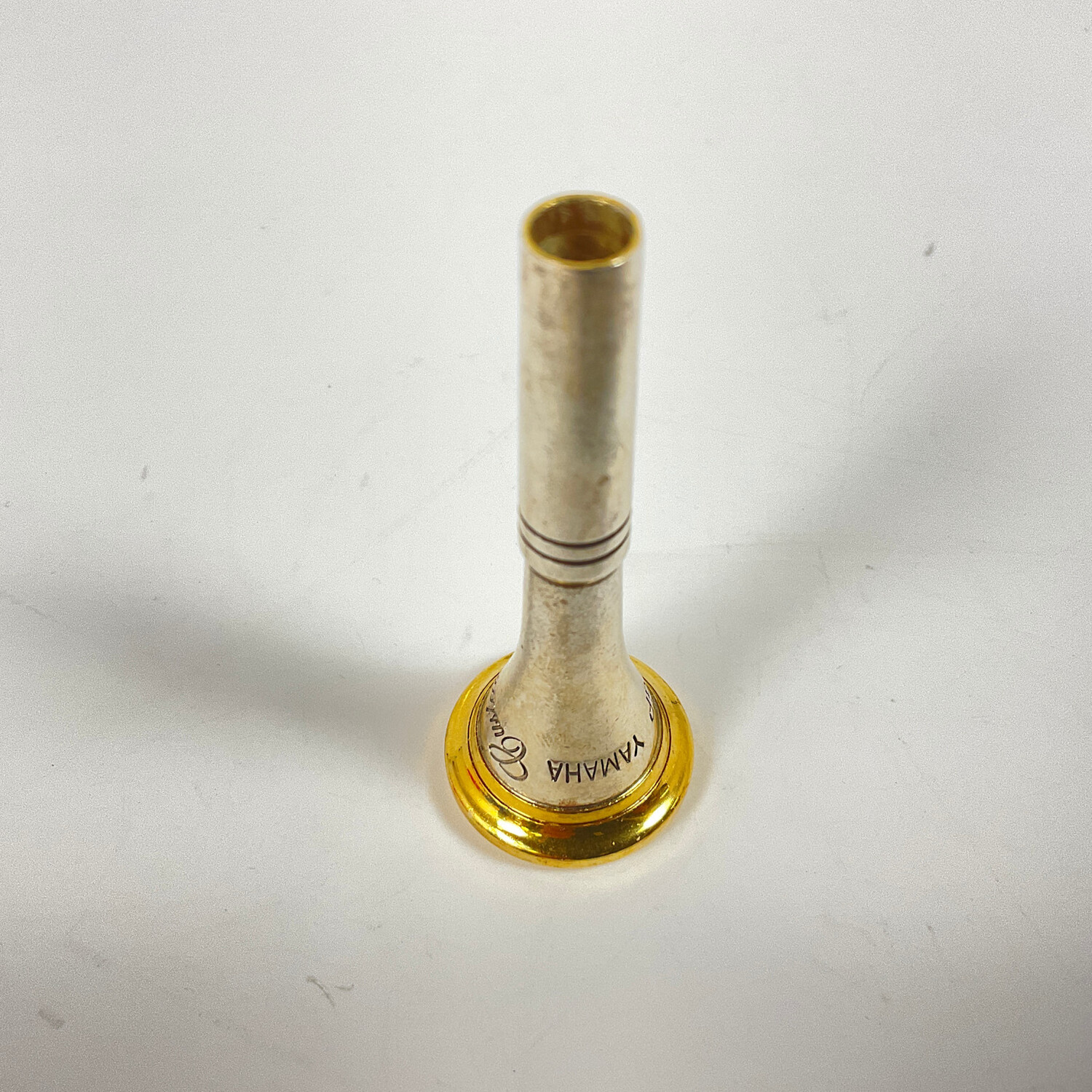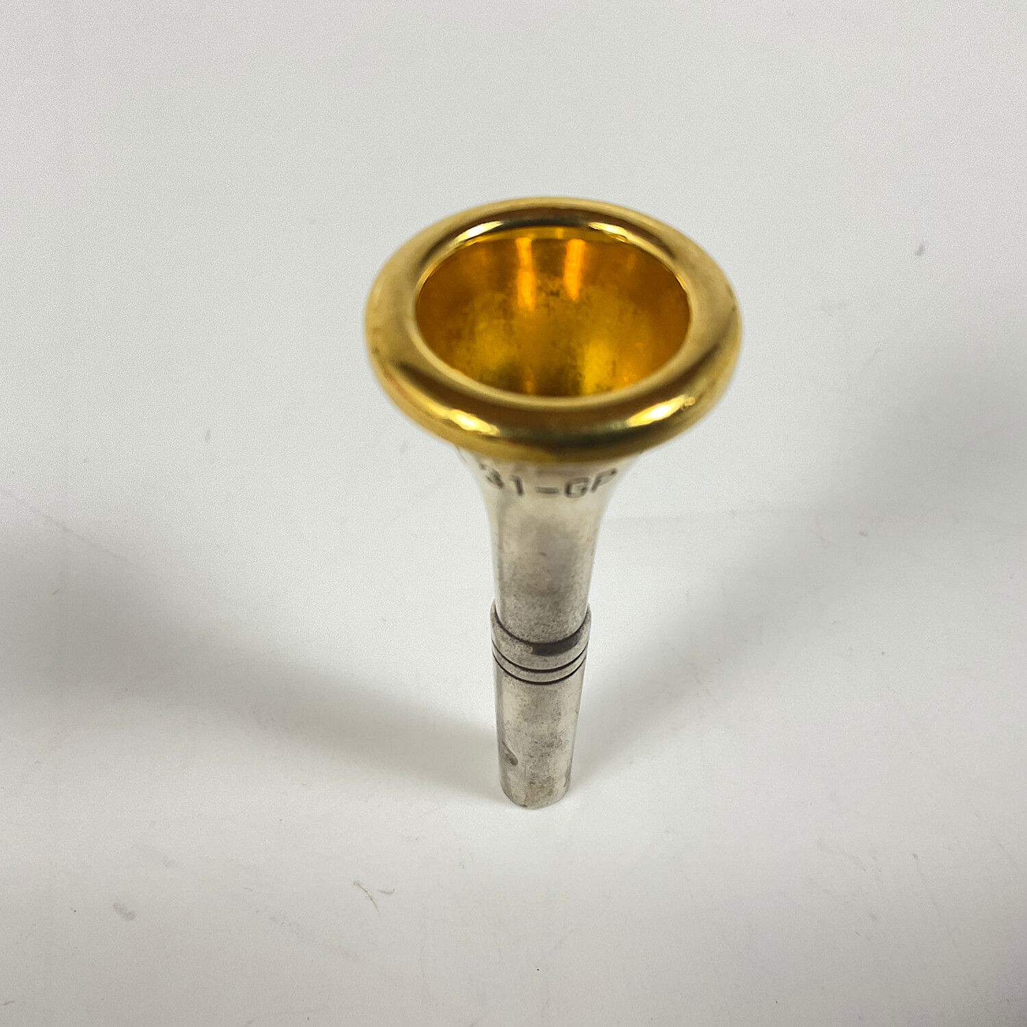 Used Yamaha 31-GP French horn mouthpiece in silver plate with gold-plated rim and cup. Mouthpiece is in good condition apart from surface scratching, insertion wear, and a slightly out-of-round shank.