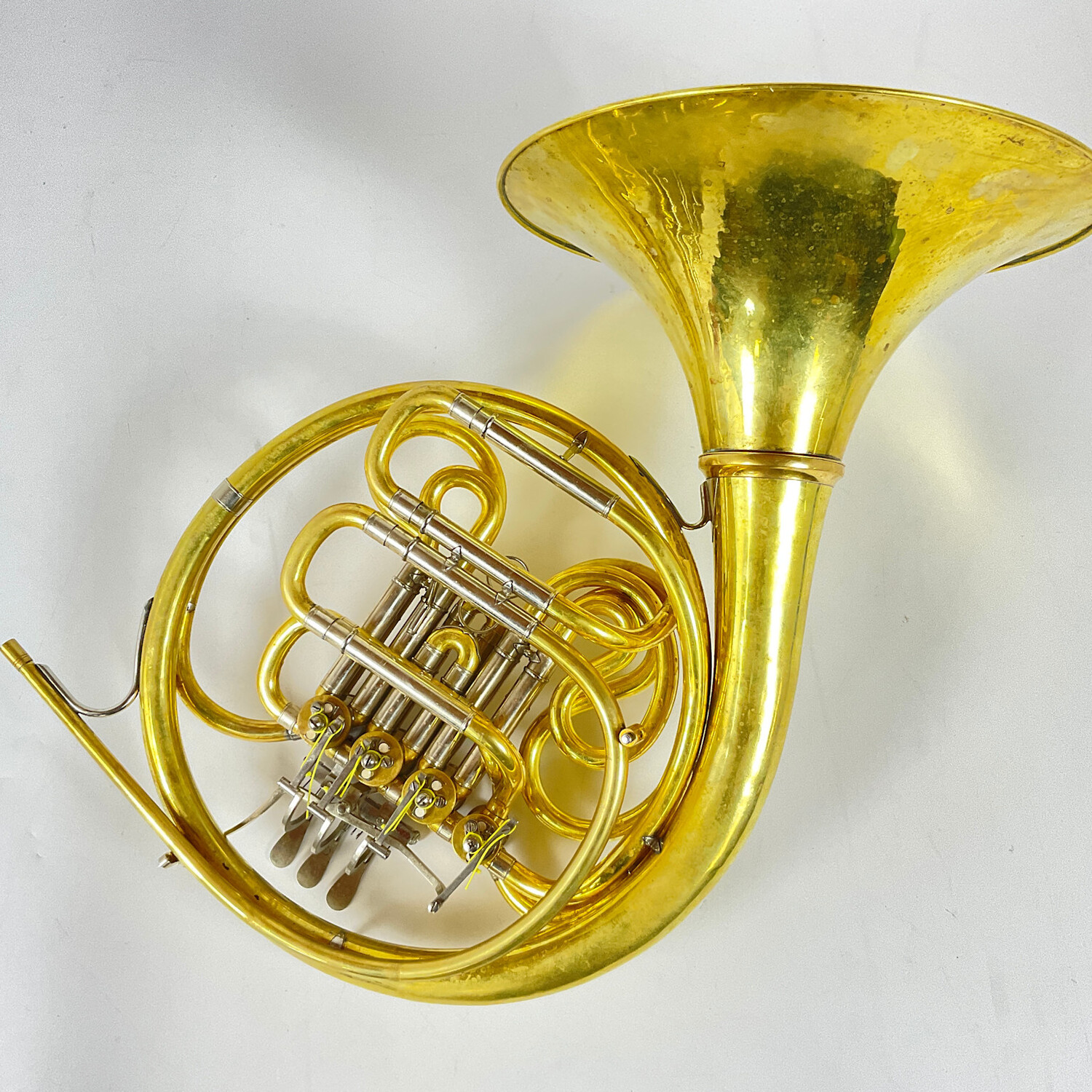 Used Yamaha YHR-667D F/Bb double French horn in raw brass. Features include a geyer/knopf wrap, 12mm bore, and detachable (Yamaha ring) medium yellow brass bell flare. This instrument has had a Cantesanu conversion and thus has a Cantesanu custom leadpipe added and has been worked on by Felix.