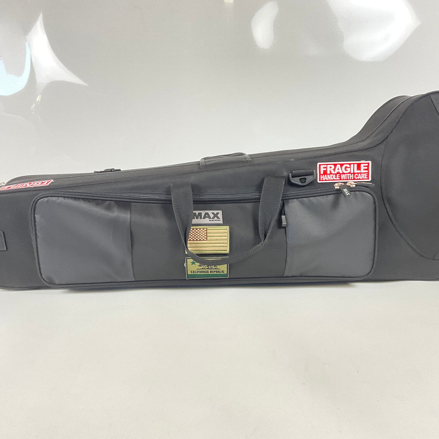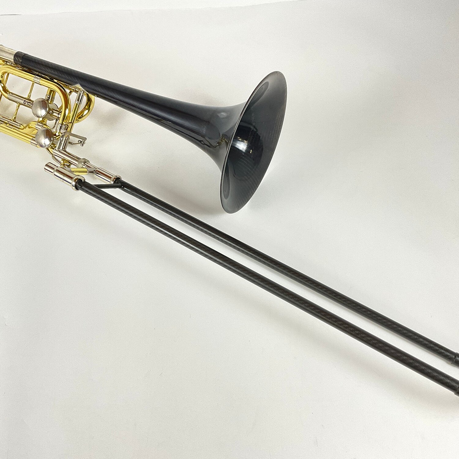 Used Yamaha YBL-822 Bb/F/D bass trombone in lacquer finish. Features include a .563" handslide with outer Butler (inner Yamaha) handslide, independent rotary valve section, and 9.5" Butler bell. Instrument is in good condition apart from surface scratching, some spots of lacquer, and some signs of soldering/epoxy where the Butler parts were added. Includes Protec case.