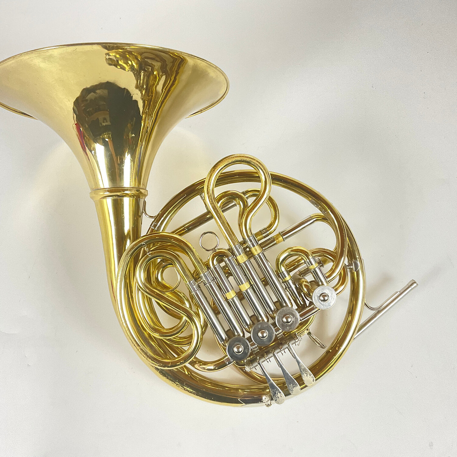 Instrument is in good condition apart from surface scratching, some lacquer/contact wear, and some dings/heavier contact wear. Compression is very good overall. This is a great playing medium bell horn and would make a terrific first double horn. Includes original case.