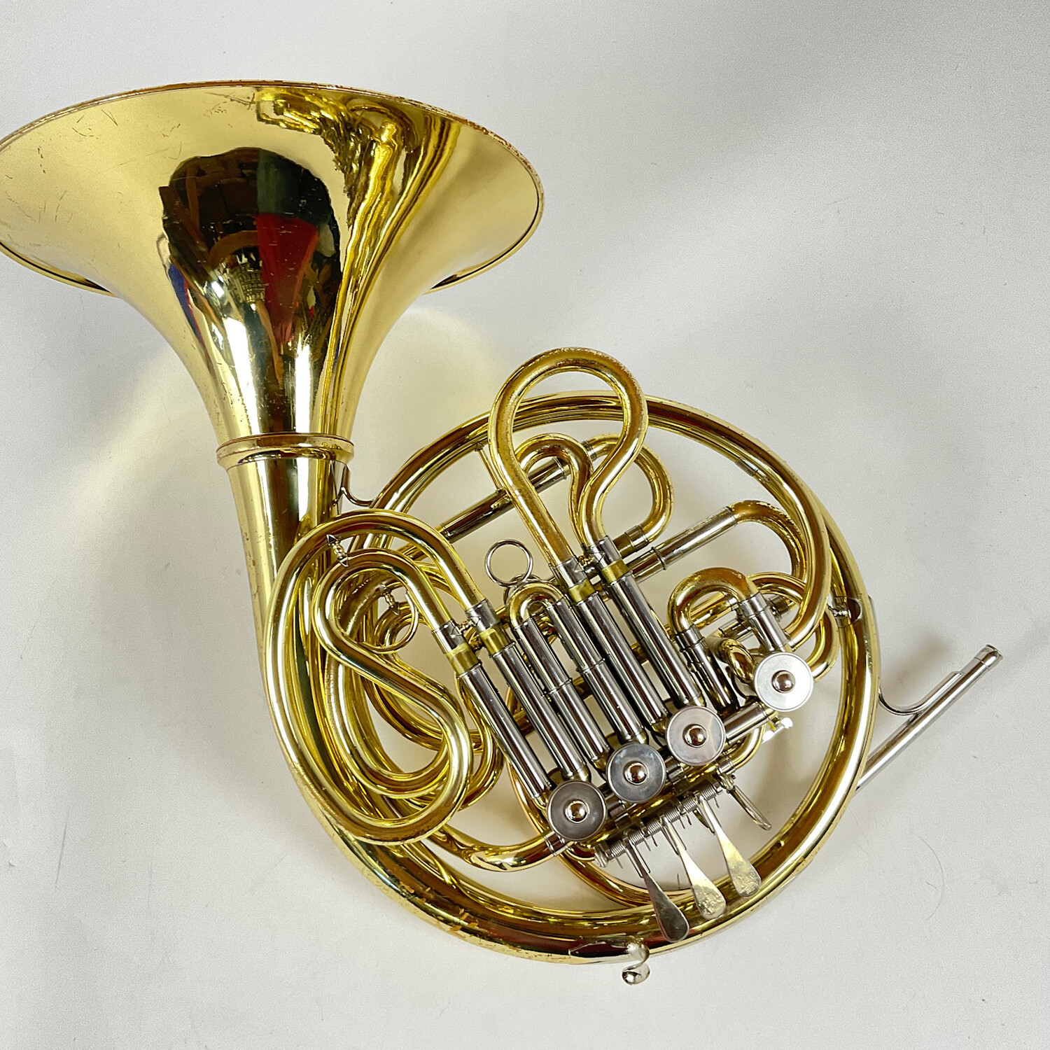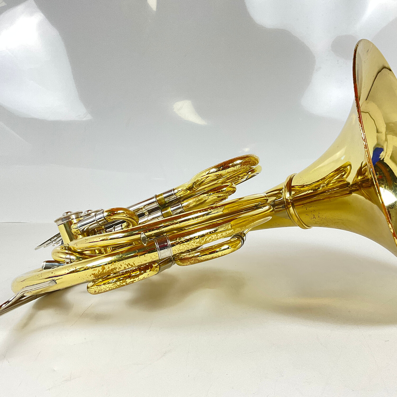 Instrument is in good condition apart from surface scratching and lacquer wear throughout, dings/dents evidence of heavier dent repair, and some wear at contact points. Includes cut bell case.